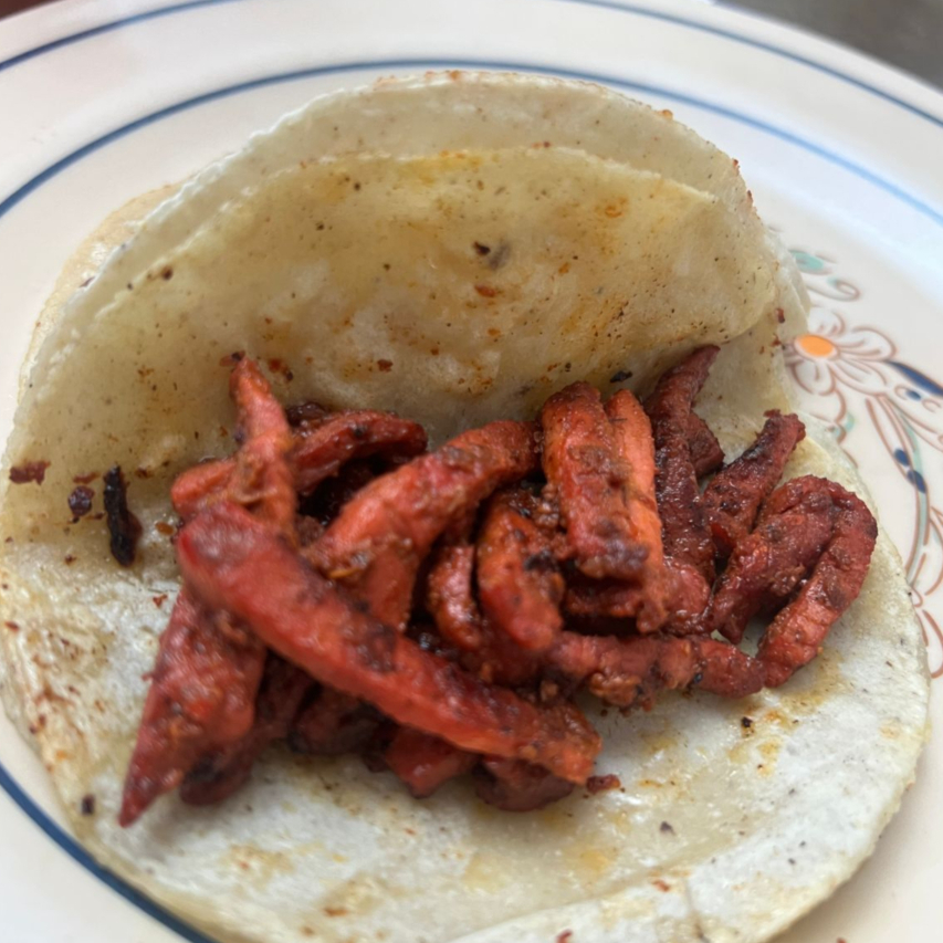 Tortilla de maíz con carne al pastor, cebolla, cilantro ( al gusto), salsa verde, roja, limones.