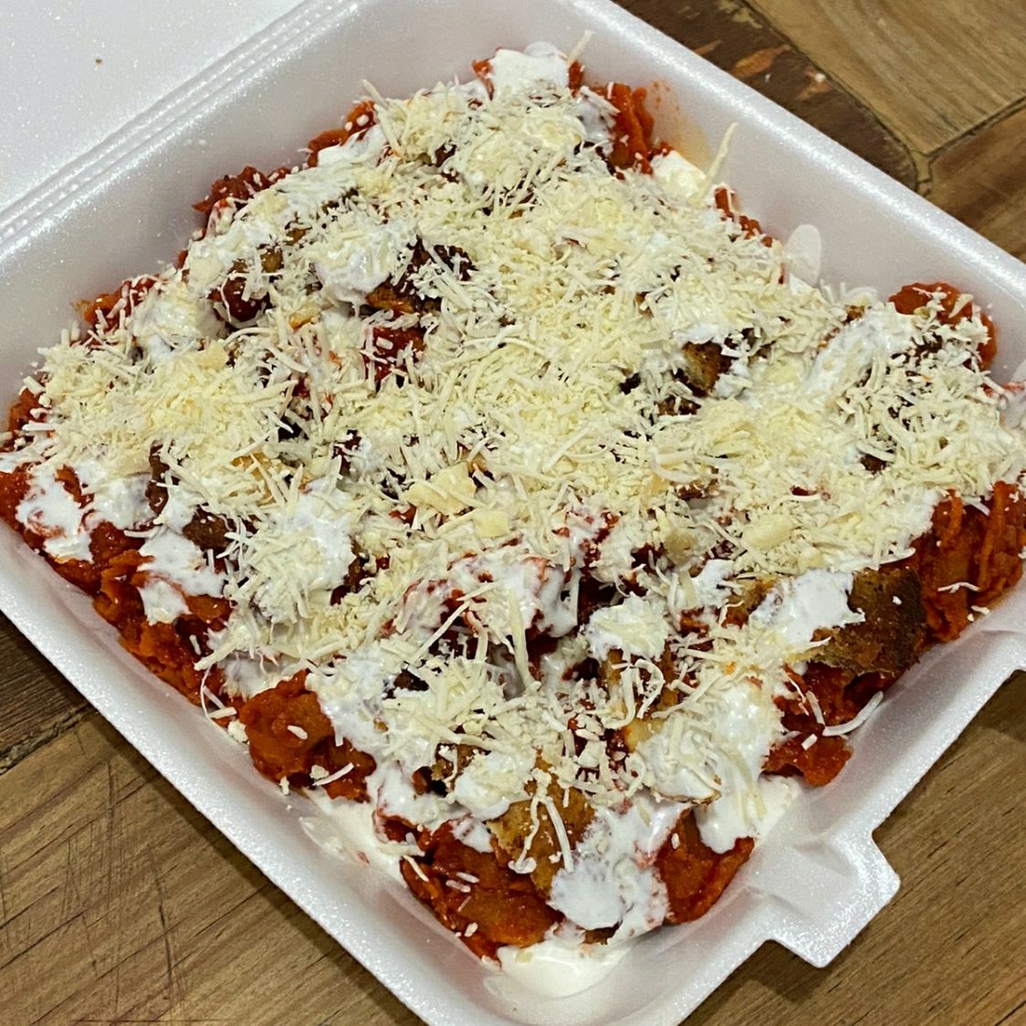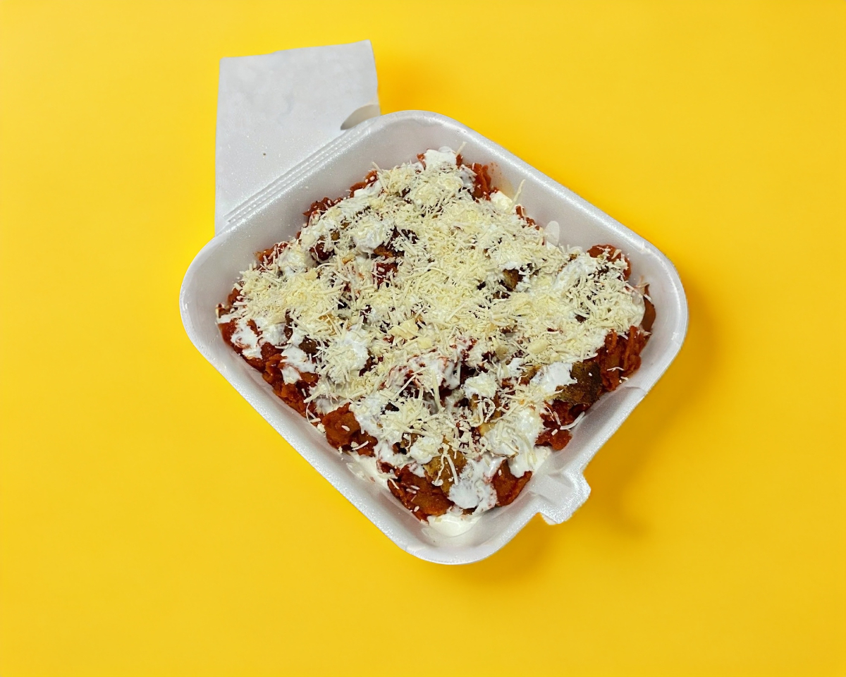 Bolillo de chilaquiles de guajillo, crema, queso y cebolla picada.