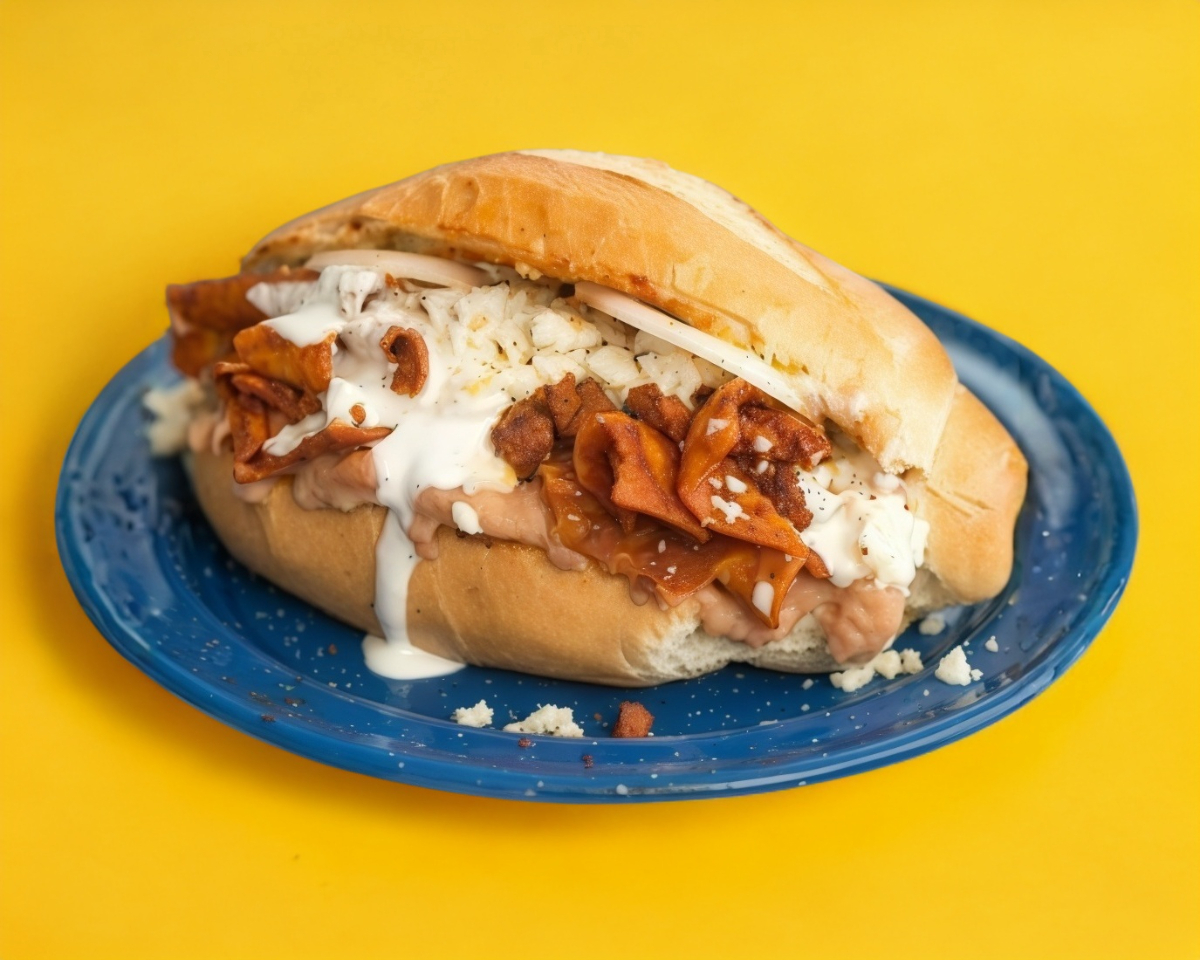 Bolillo de chilaquiles de guajillo con pechuga de pollo, acompañado con cebolla picada.