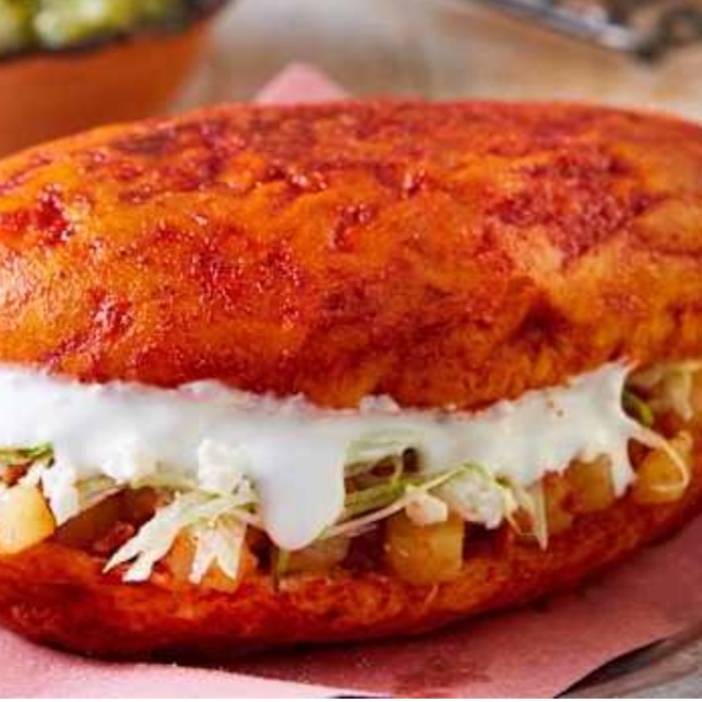 Pambazos bañado en salsa de guajillo el relleno puede ser de pollo /papas con chorizo,crema queso ranchero y lechuga