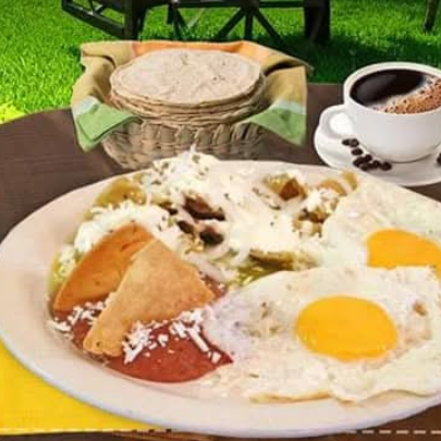 5 tortillas fritas rellenas de pollo bañadas en salsa de tu elección roja,verde ,pasilla, guajillo,queso ranchero,crema y cebolla incluye café y fruta