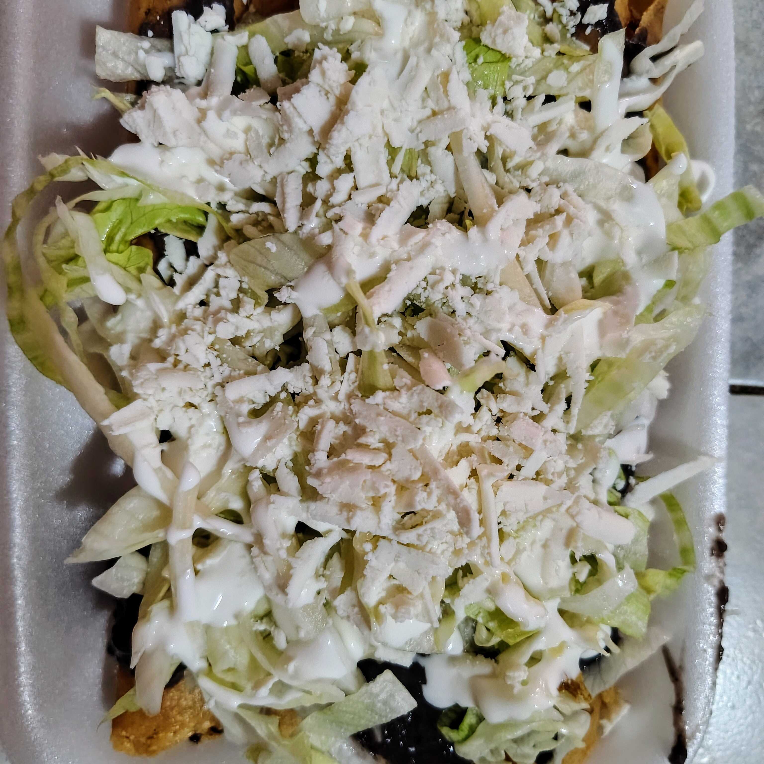 Tortillas (2)doradas en salsa roja o verde a elegir lleva frijoles embarrados en las tortillas