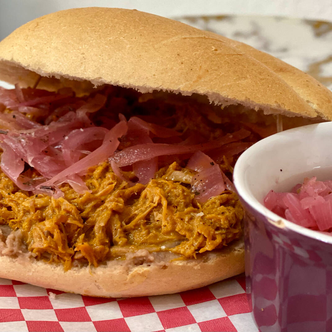 Torta Con Cochinita Don Lencho, Sentada en una Cama de Frijolitos Refritos de la Casa, Adornada con las Crujientes Cebollitas Moradas al vinagre.