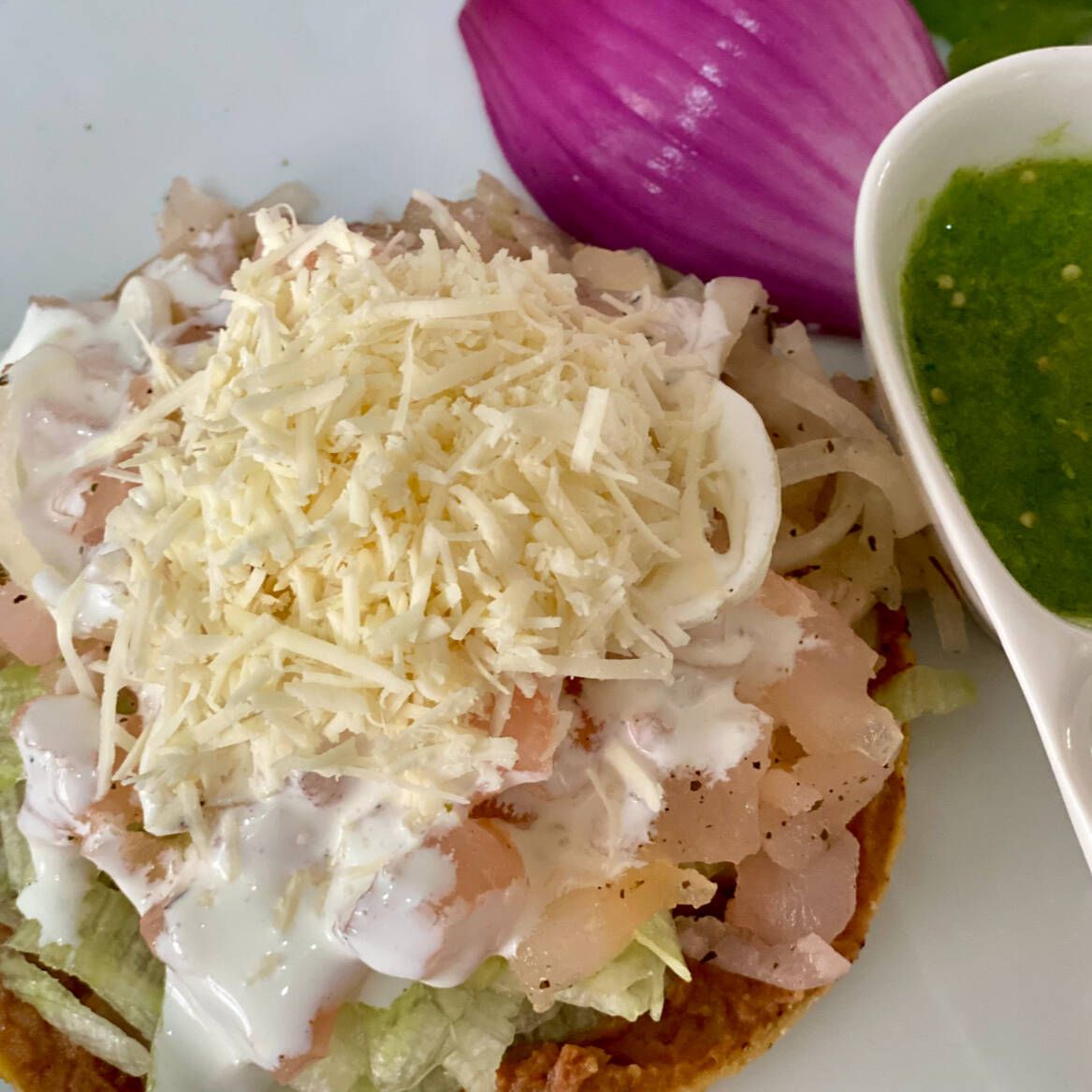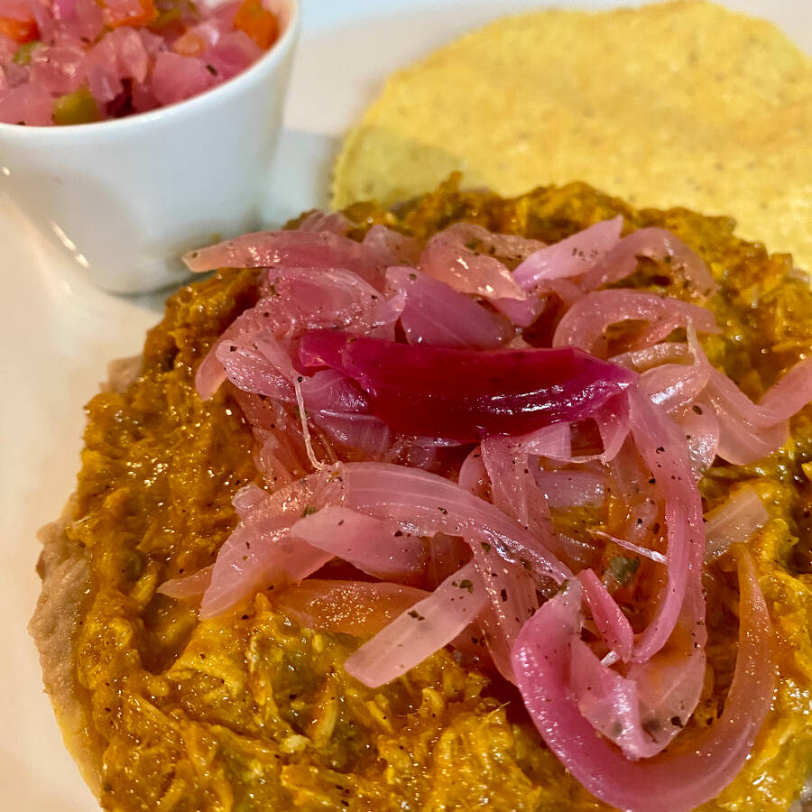 Exquisita pata de res, sentada en una crujiente tostada con frijolitos, cubierta de fresca lechuga, crema y queso.