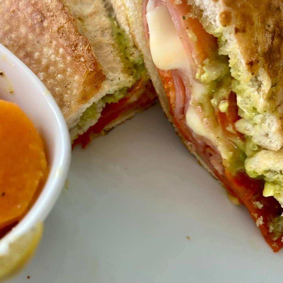 Pan Artesanal del Día, con cama de frijolitos de la casa, deliciosa pierna española, Queso Oaxaca, aguacate, jitomate, cebolla y chiles en vinagre Don Lencho