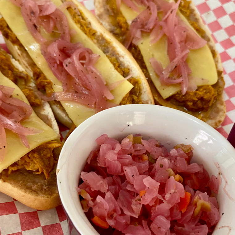 Tres medias piezas de bolillo, acariciadas por frijolitos de la casa, cochinita pibil y queso fundido. Adornadas con salsa de la casa (cebollita morada con habanero y limón) o el tradicional pico de gallo