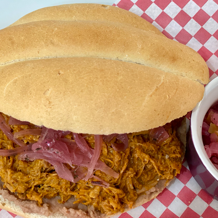 Deliciosa Torta Con Cochinita Don Lencho, Cama de Frijolitos de la Casa y Cebollitas Moradas.