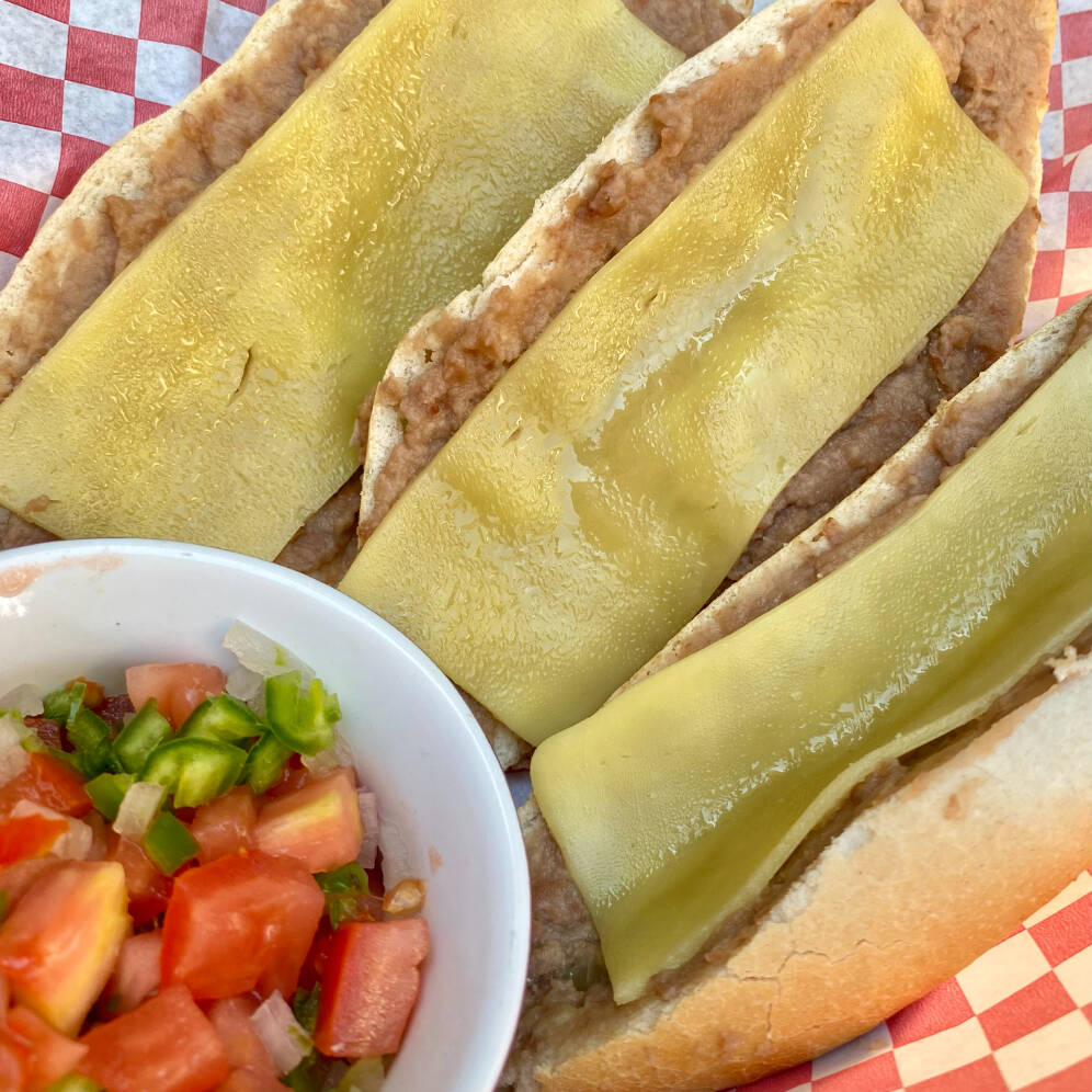 Tres medias piezas de bolillo, acariciados por frijolitos y queso fundido, acompañados por la salsa de la casa (cebollita morada con chile habanero y limón) o la tradicional salsa pico de galo.