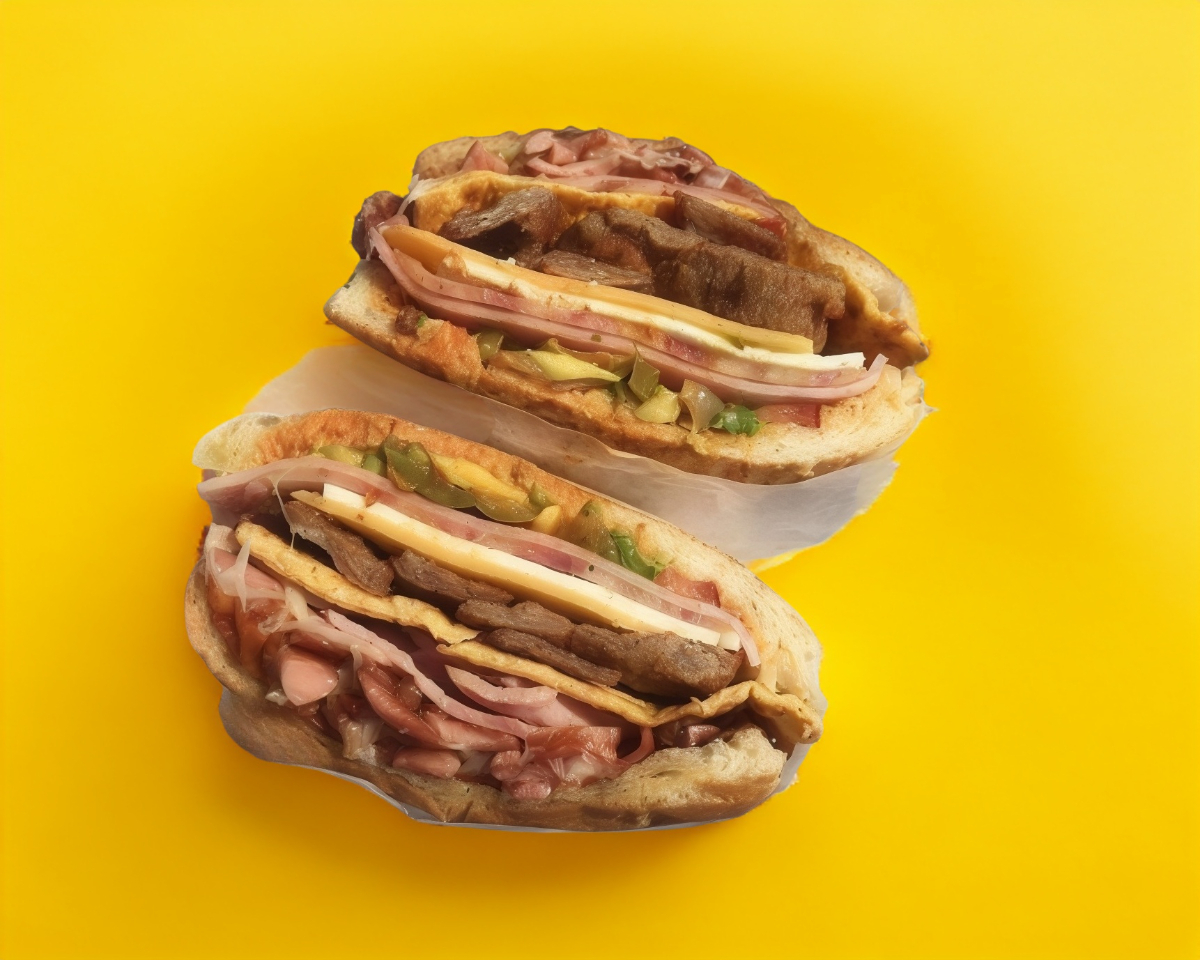 Doble jamón de pierna, doble salchicha de pavo, doble pierna española, Queso Oaxaca gratinado, Queso tipo manchego, Frijoles, Aguacate, Jitomate y cebolla.