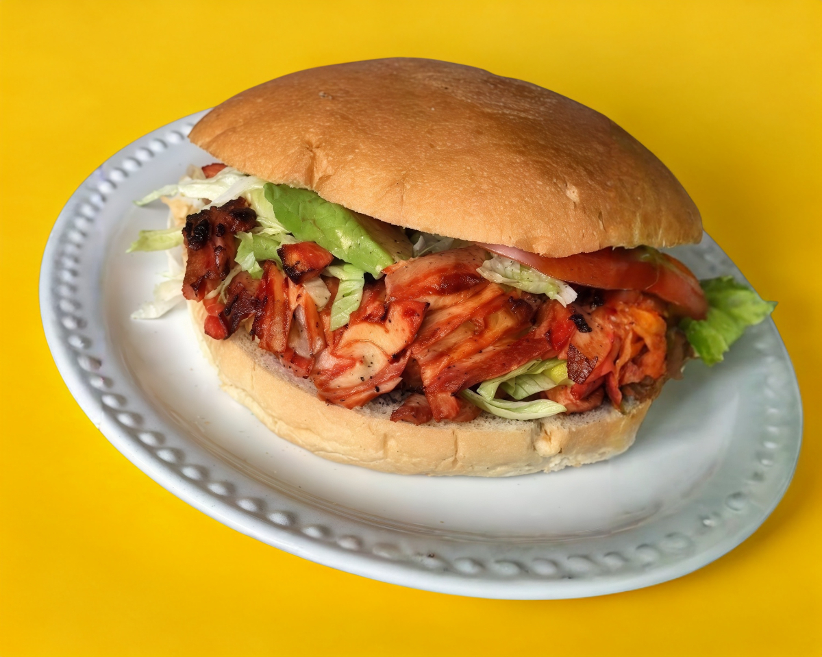 Pan telera normal, pastor con piña, Jamón de pavo, queso oaxaca, queso manchego, Aguacate, cebolla y cilantro.