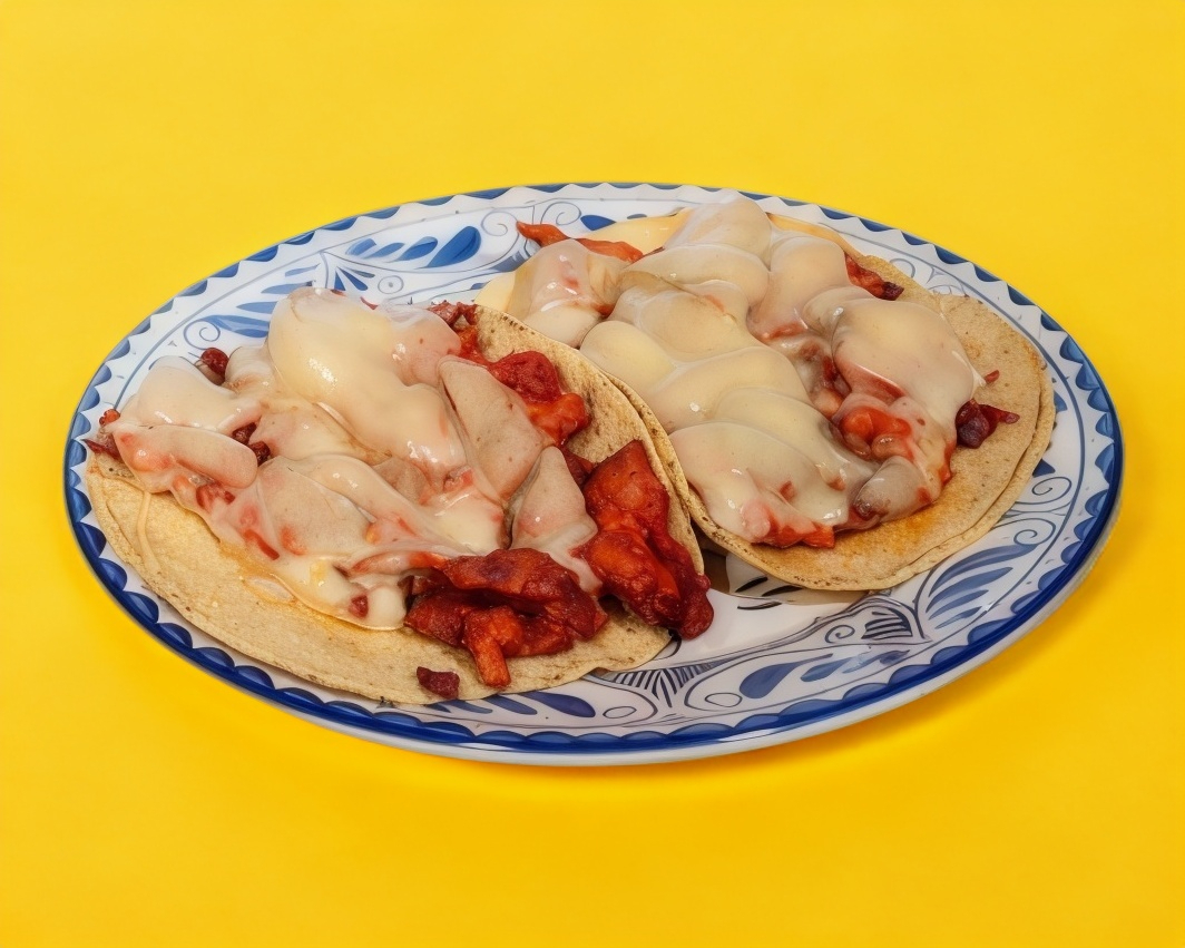 Carne al pastor con delicioso queso, cebolla caramelizada y cilantro