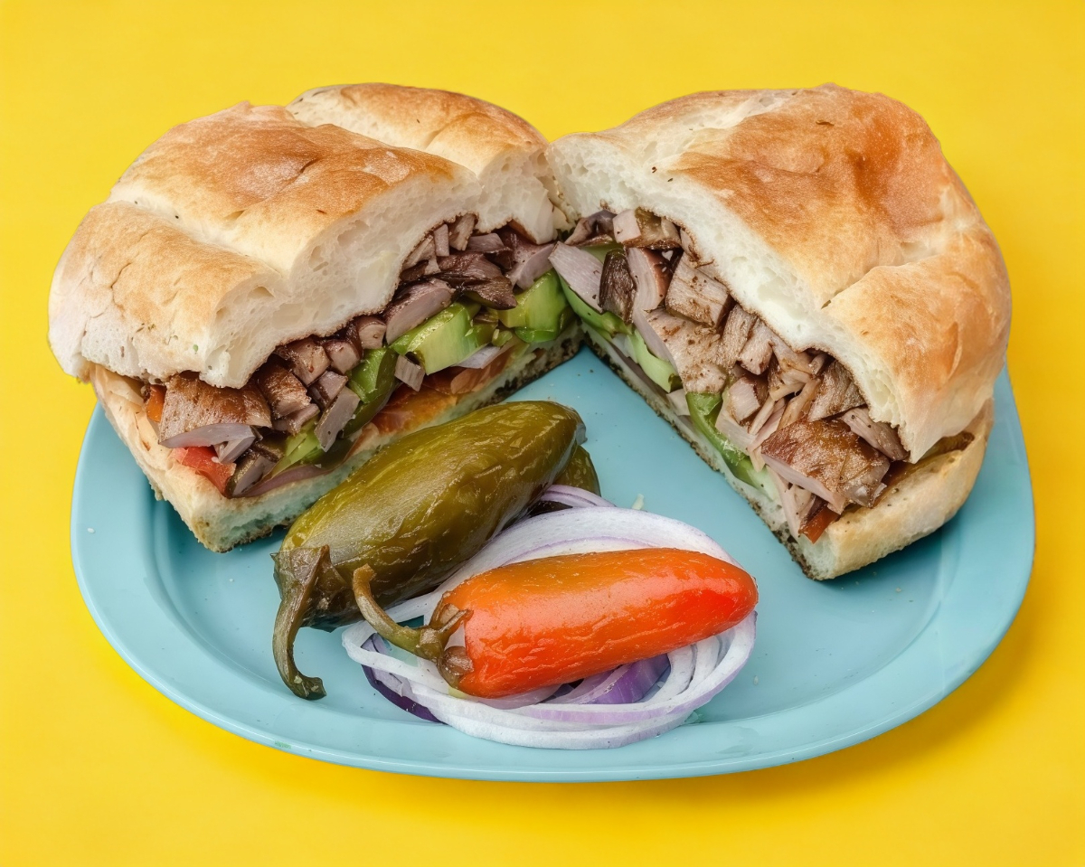 Telera doble del dia, Delicioso Pastor, bistec, longaniza, jamón de pavo, pierna española, salchicha, queso Oaxaca gratinado, frijoles, aguacate, jitomate, chile en vinagre y cebolla caramelizada. (Salsas verde y roja por aparte a gusto del cliente).
