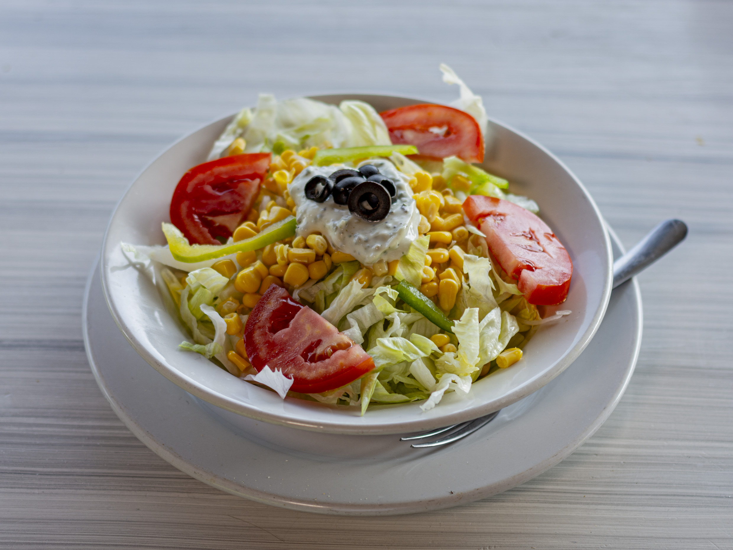 Lechuga, jitomate, pimiento, aceitunas, elote y aderezo casero.