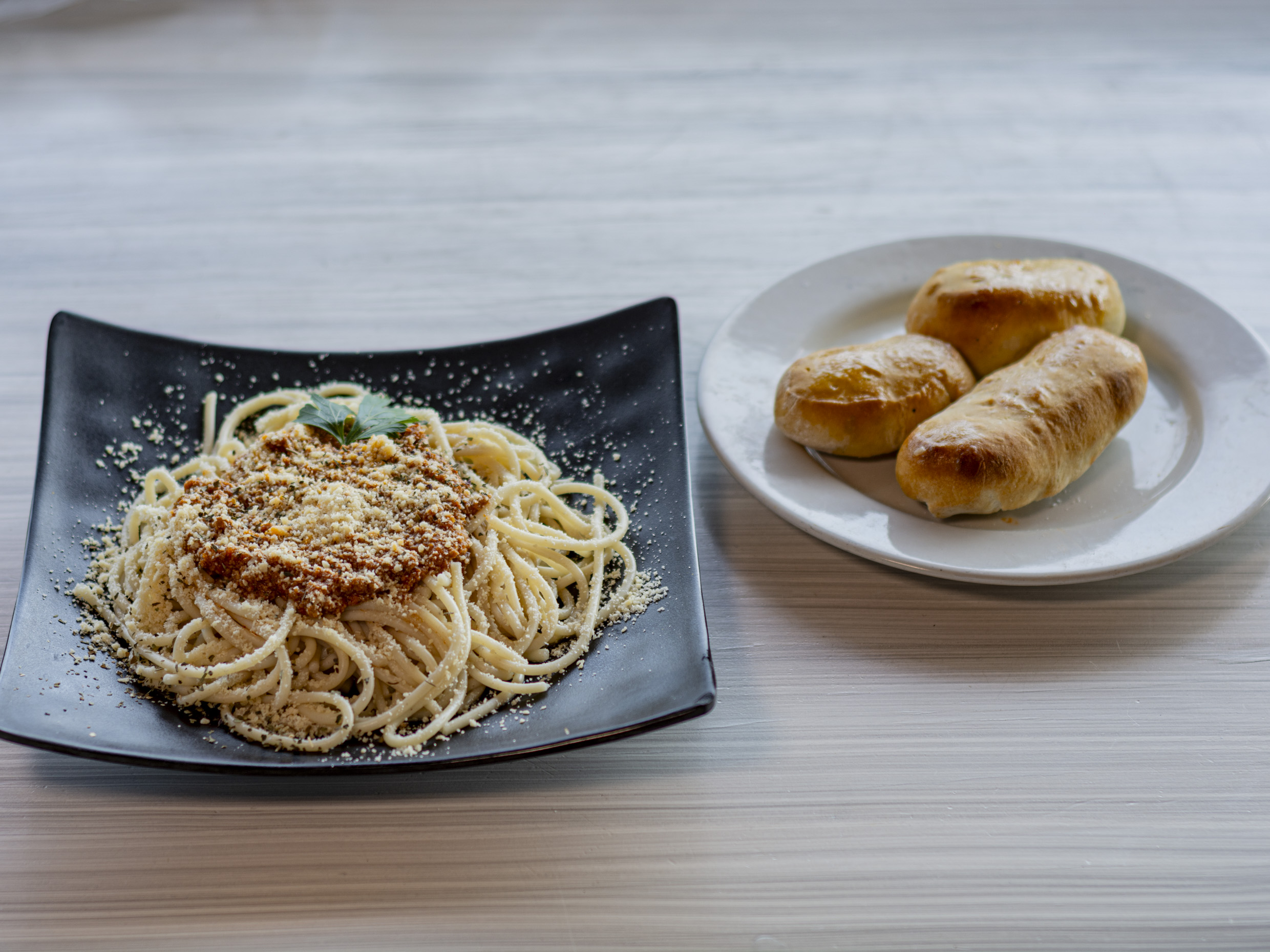 Pasta tipo espagueti con especialidad a escoger y 3pz de panecillos con mantequilla y ajo