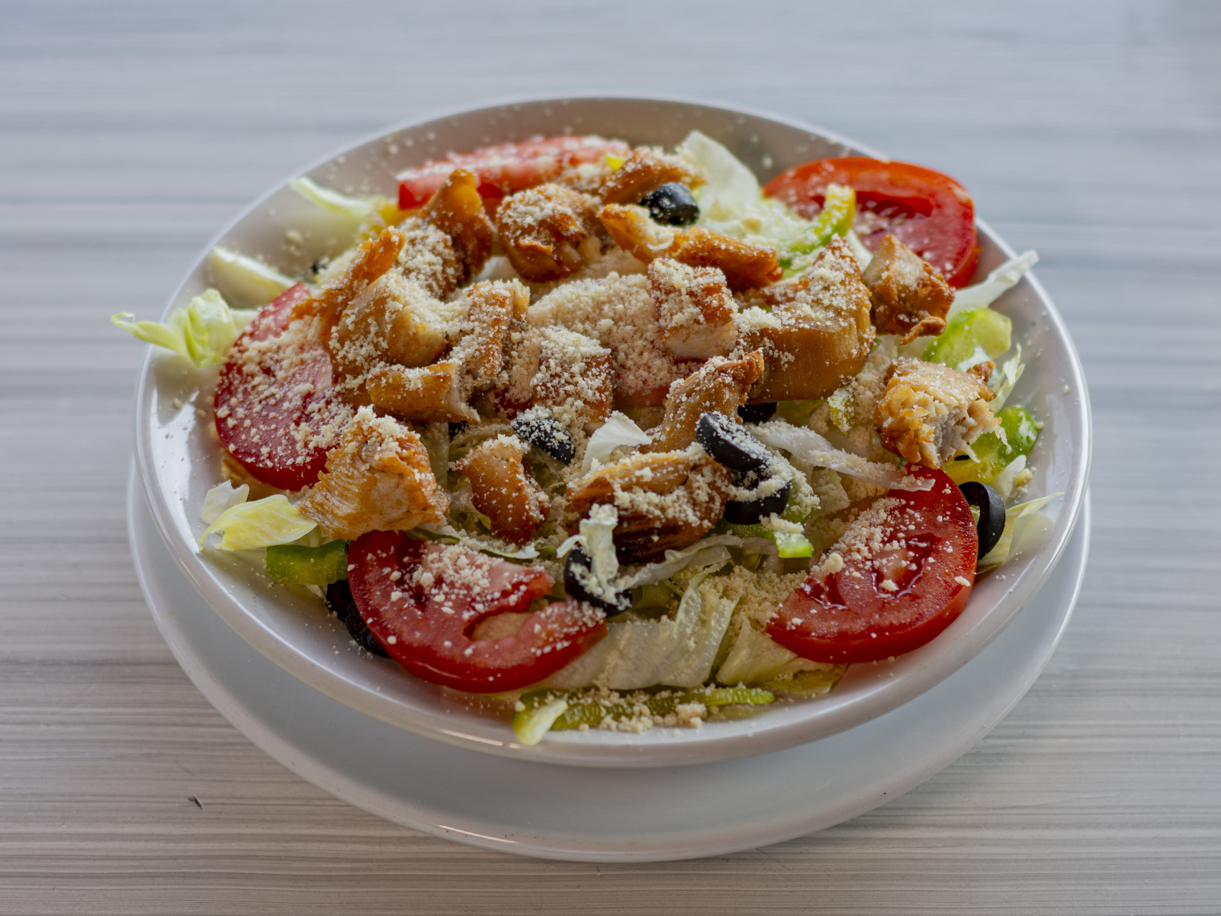 Lechuga, jitomate, pimiento, aceitunas, tiras de pollo, queso parmesano, aderezo ranch.