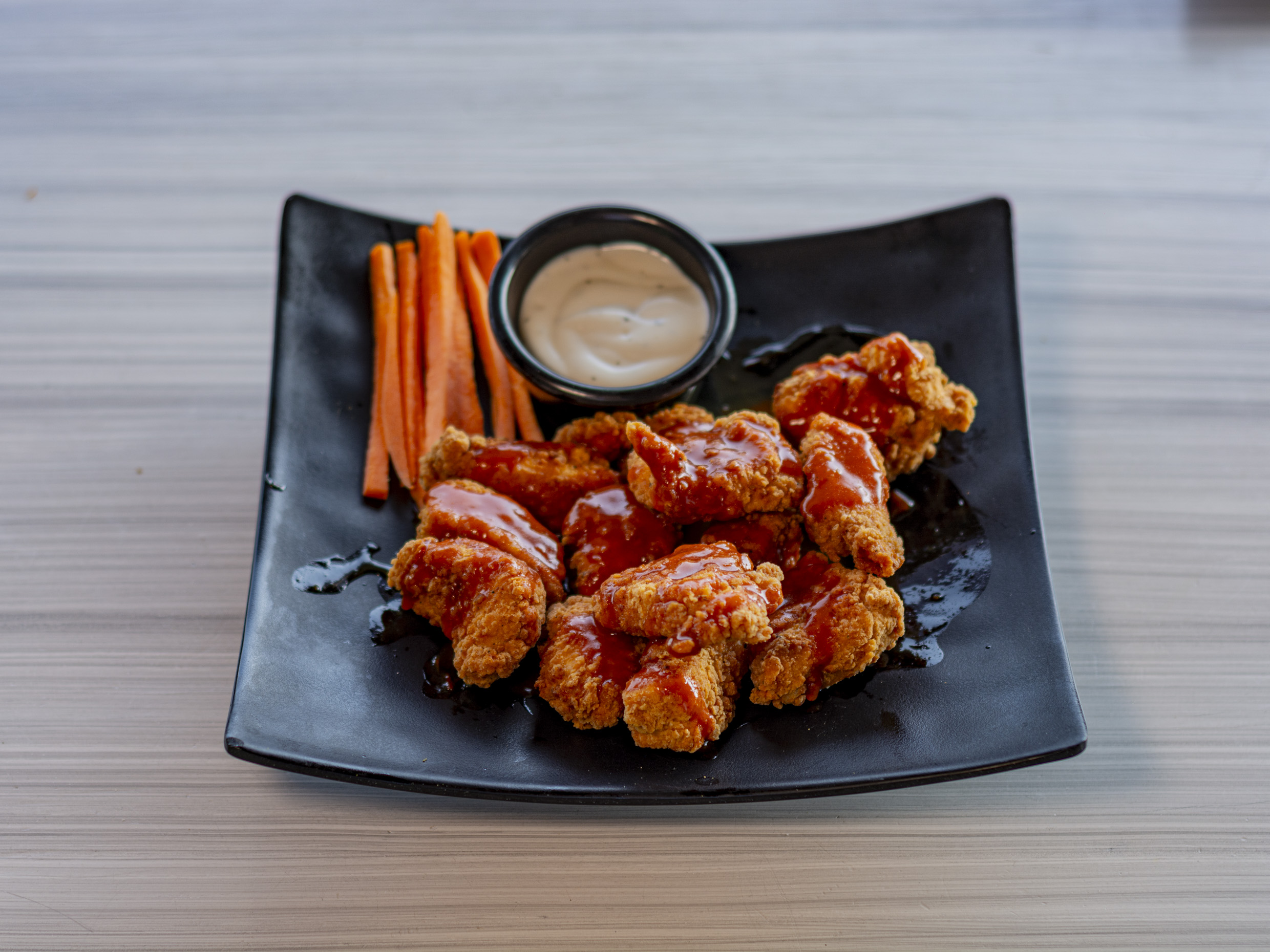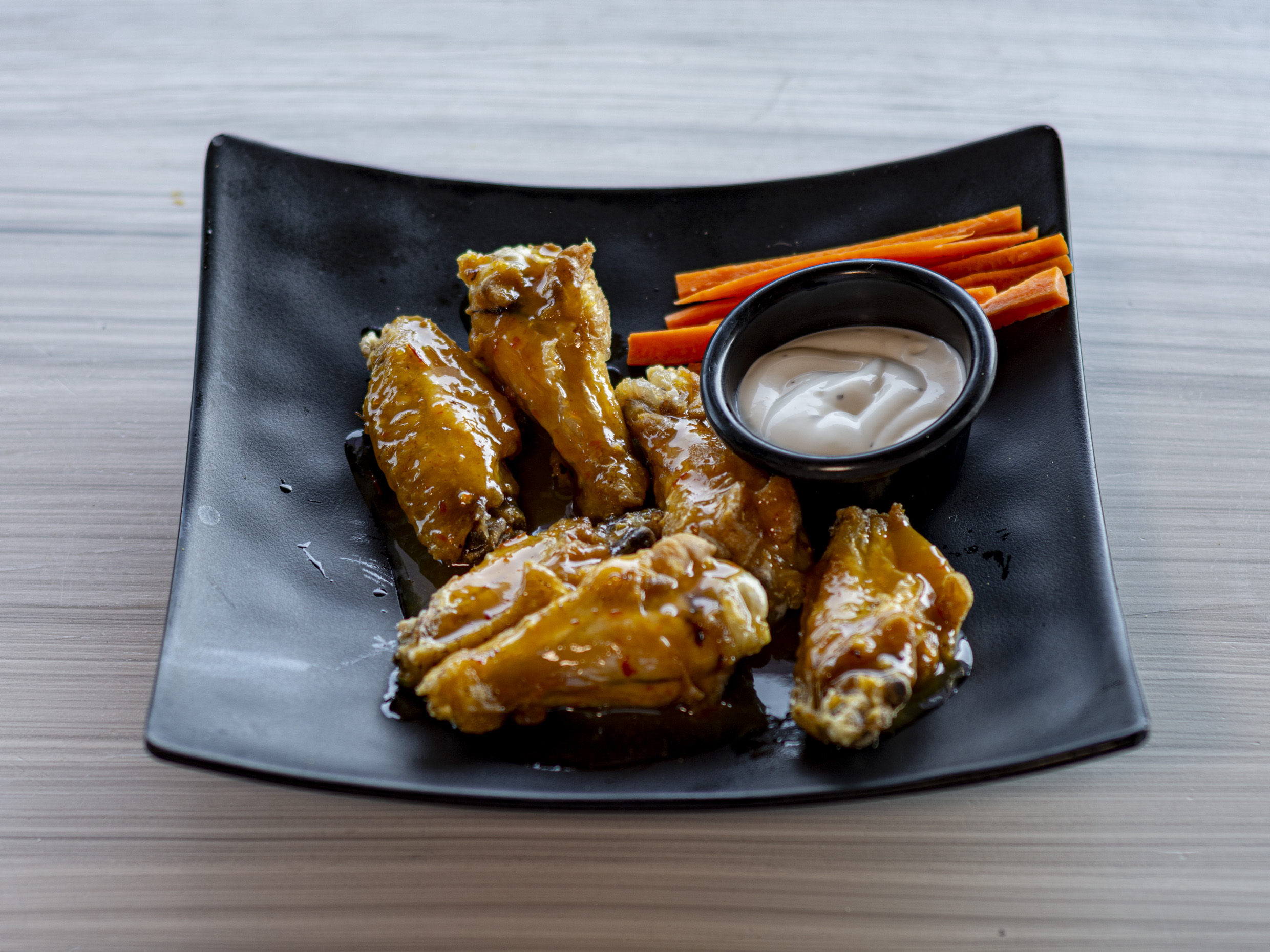 6pz de alitas, salsa a escoger, una porción de aderezo ranch, zanahoria