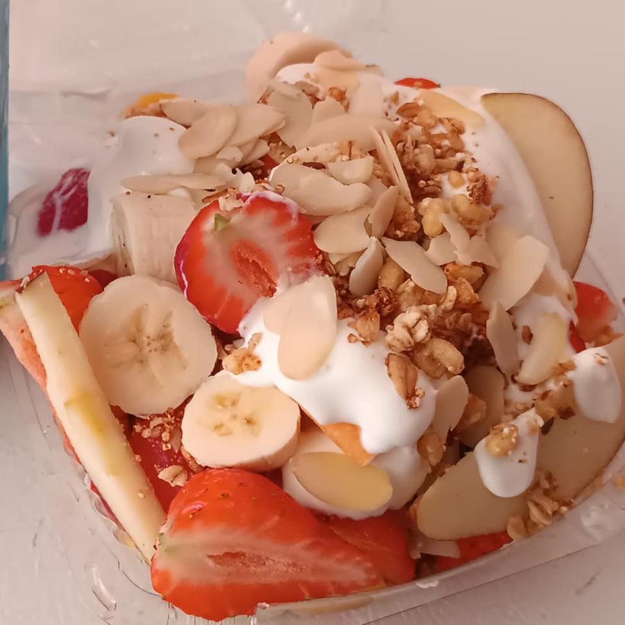 FRUTAS, YOGURT OIKOS, ALMENDRAS, GRANOLA