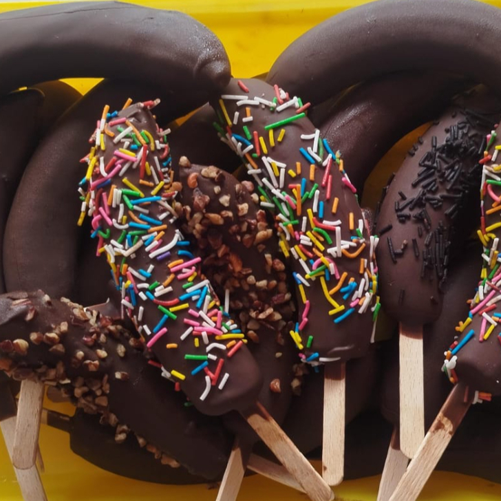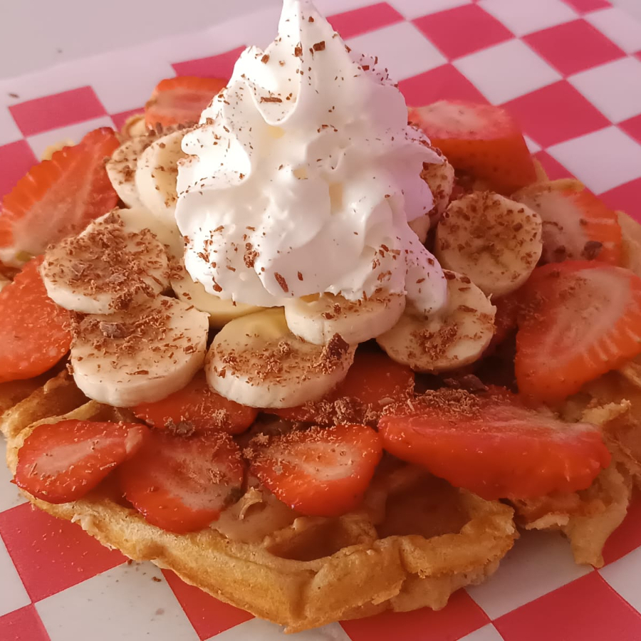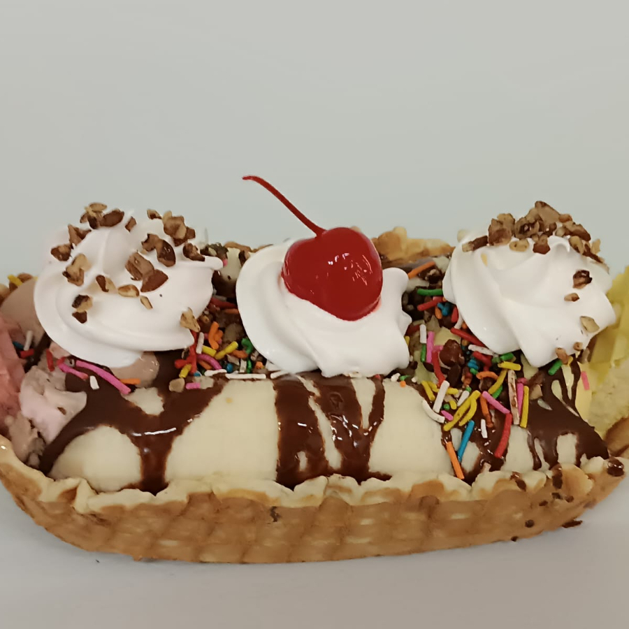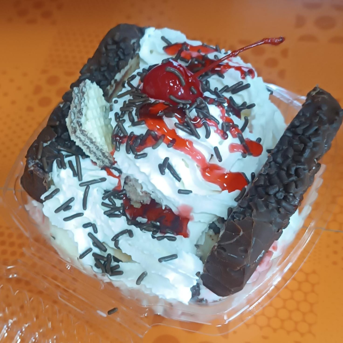 Helado, Chantilly, cobertura chocolate, chispas de colores y chocolate o nuez, cereza, galleta