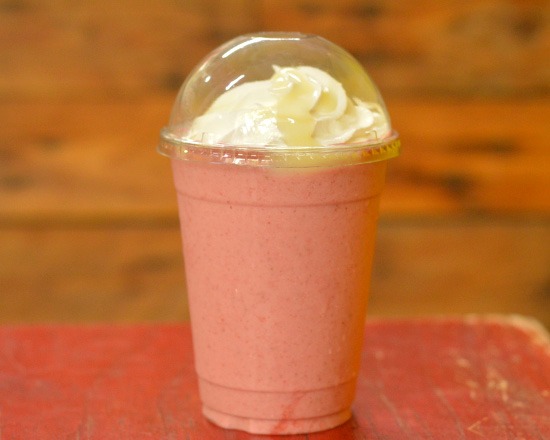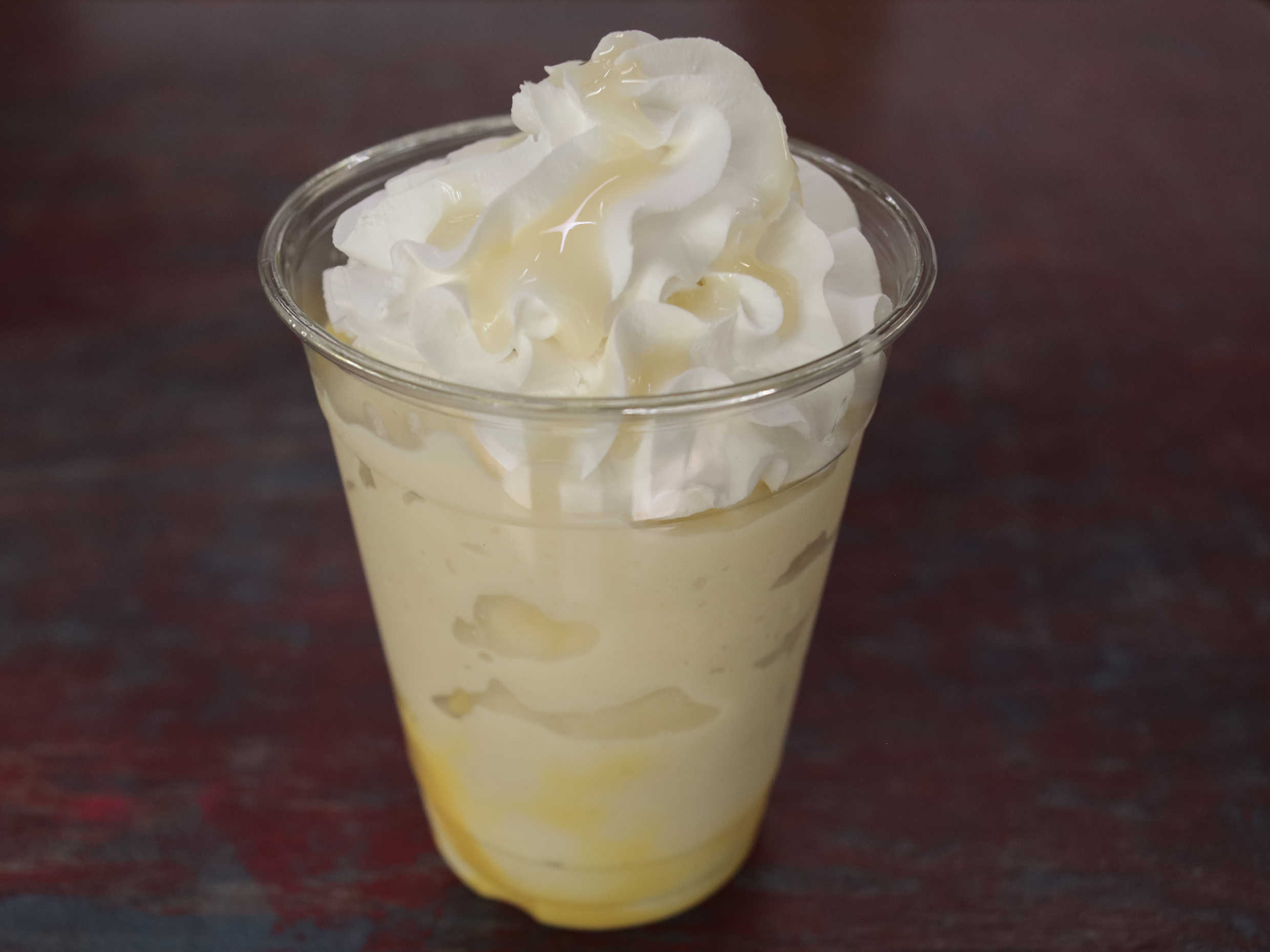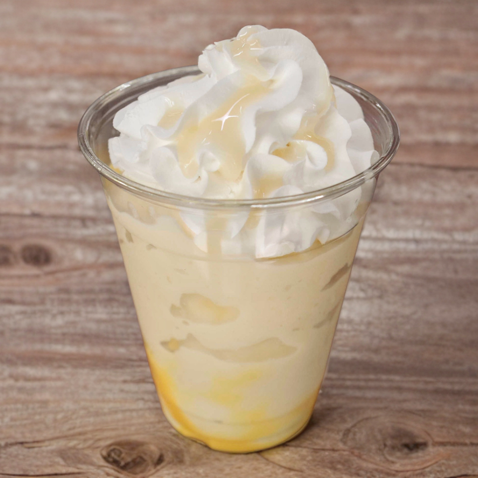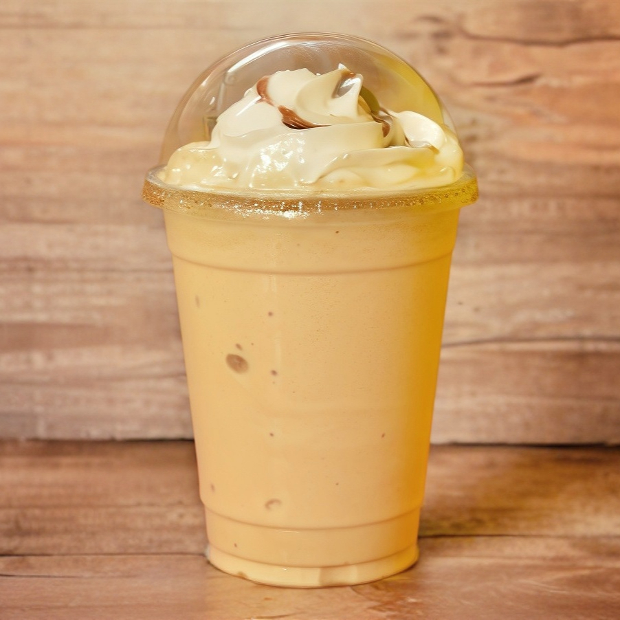 Frappé elaborado con queso philadelphia y rompope, se sirve con crema batida