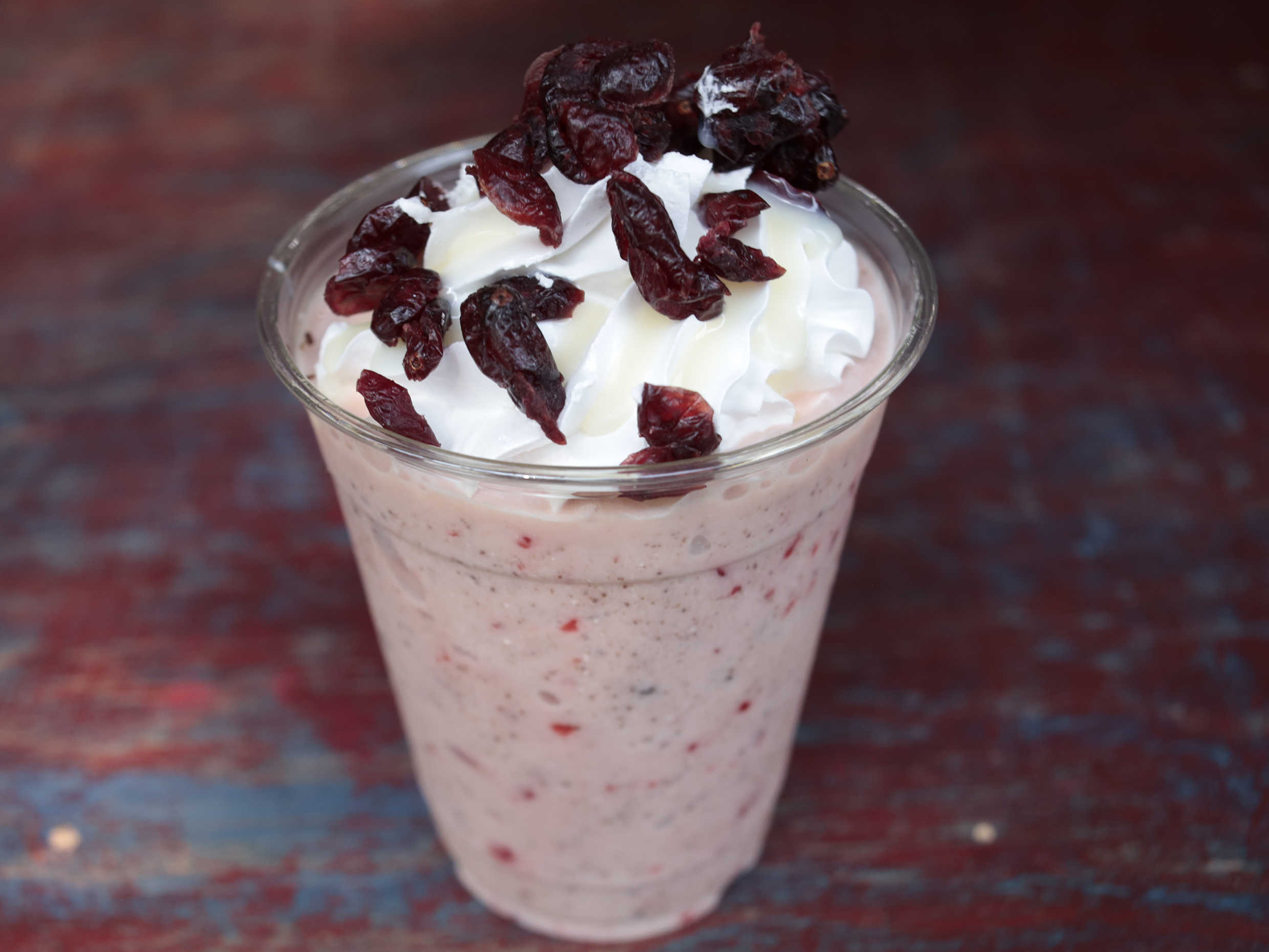 Frappé elaborado con queso philadelphia y arandanos, se sirve con crema batida