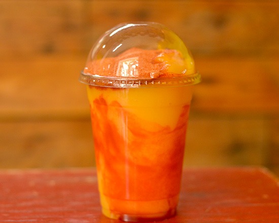 Frappé frutal de mango con chamoy, Miguelito y banderilla de tamarindo