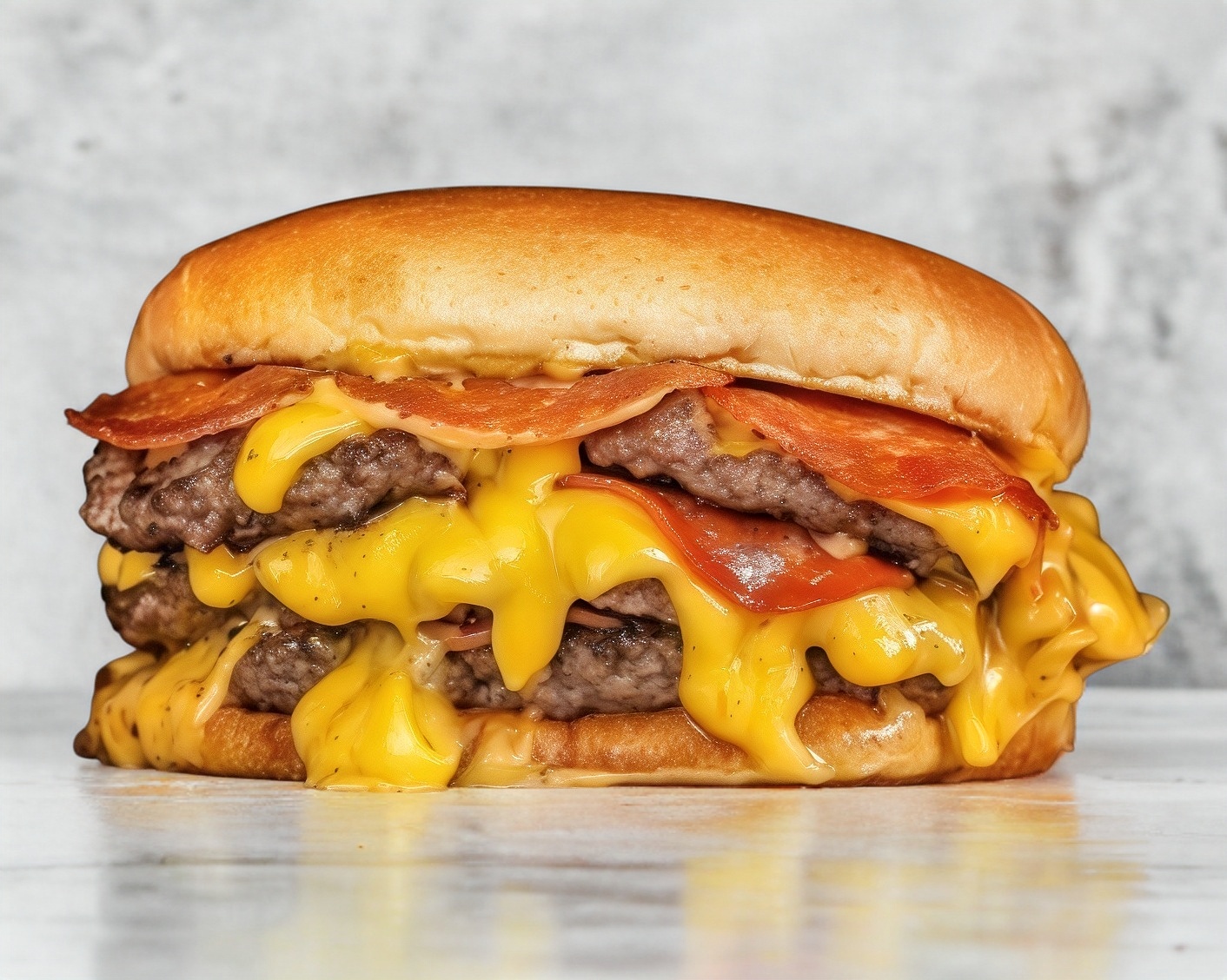 Hamburguesa de res en bollo de la casa, con queso cheddar, aros de cebolla, tocino, salsa BBQ, pepinillos, lechuga, acompañada de papas a la francesa.