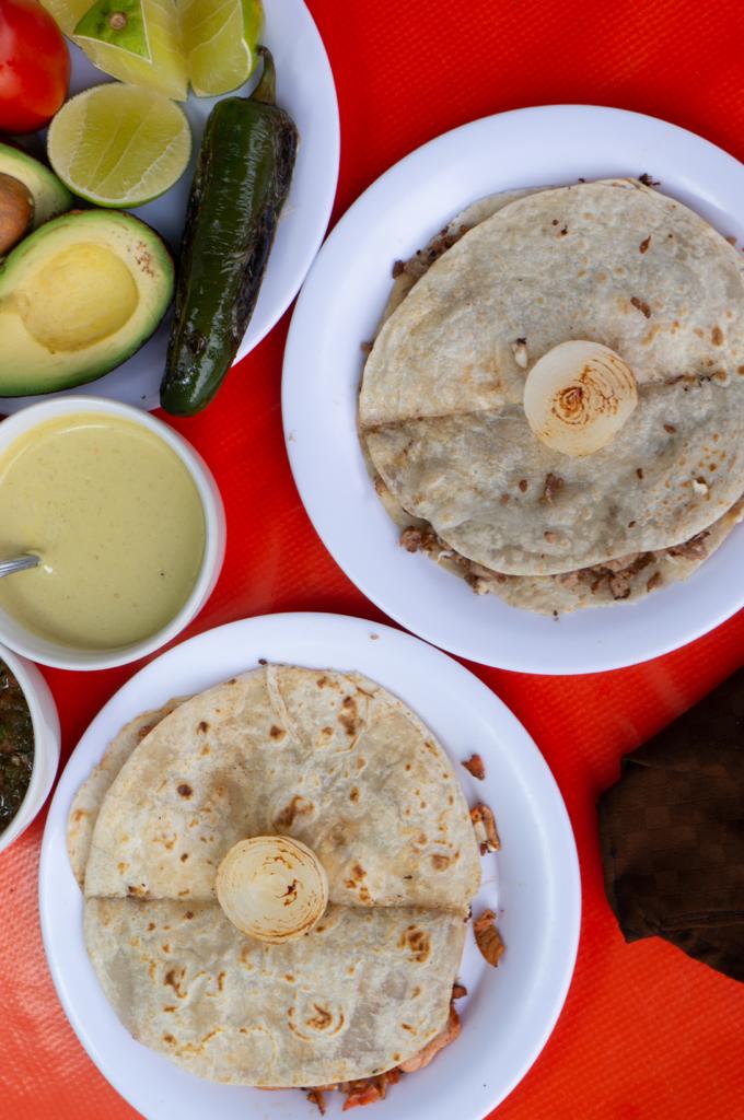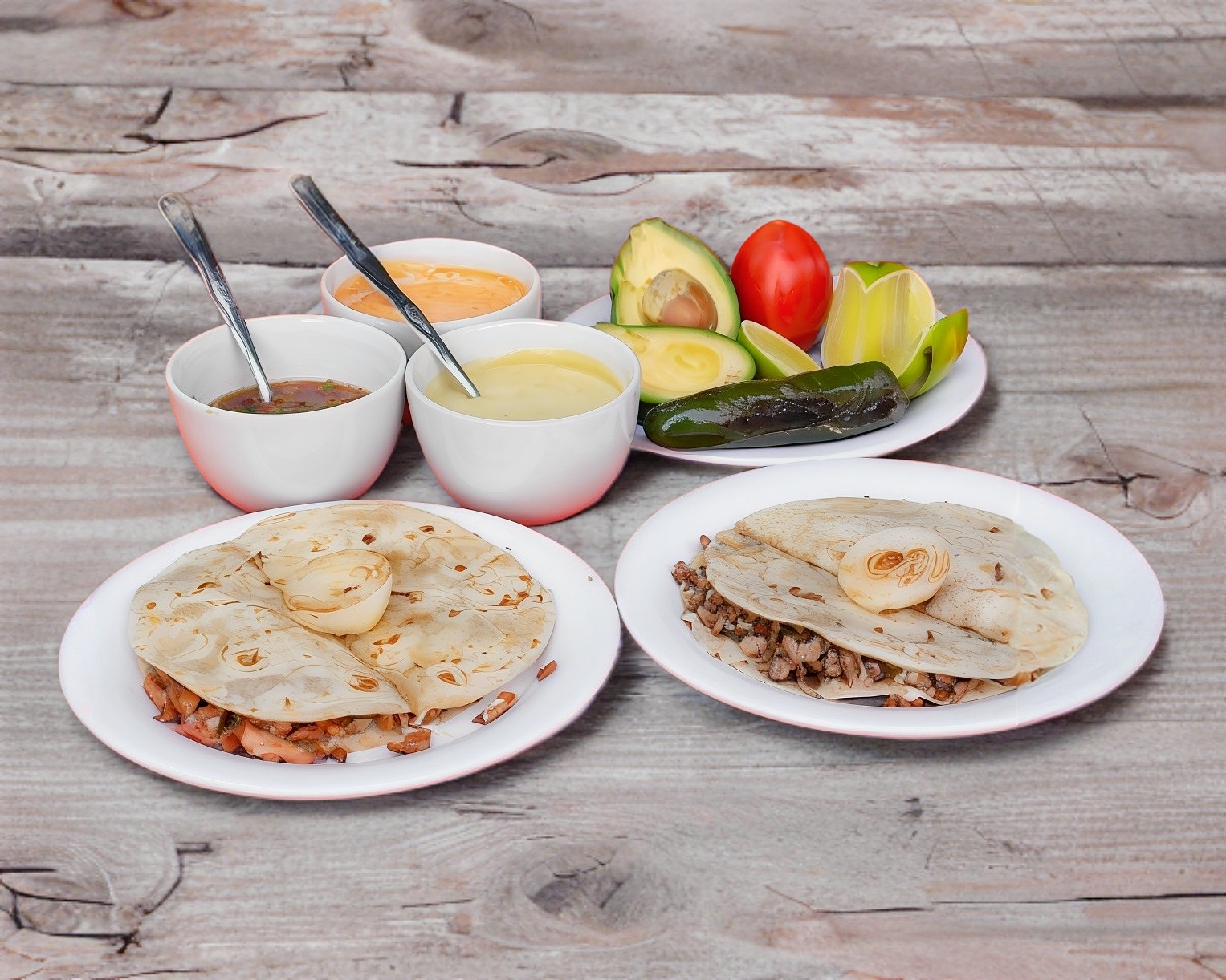 Deliciosa carne de puerco servido con queso en 2 tortillas de harina, acompañado de cebollas y salsa.