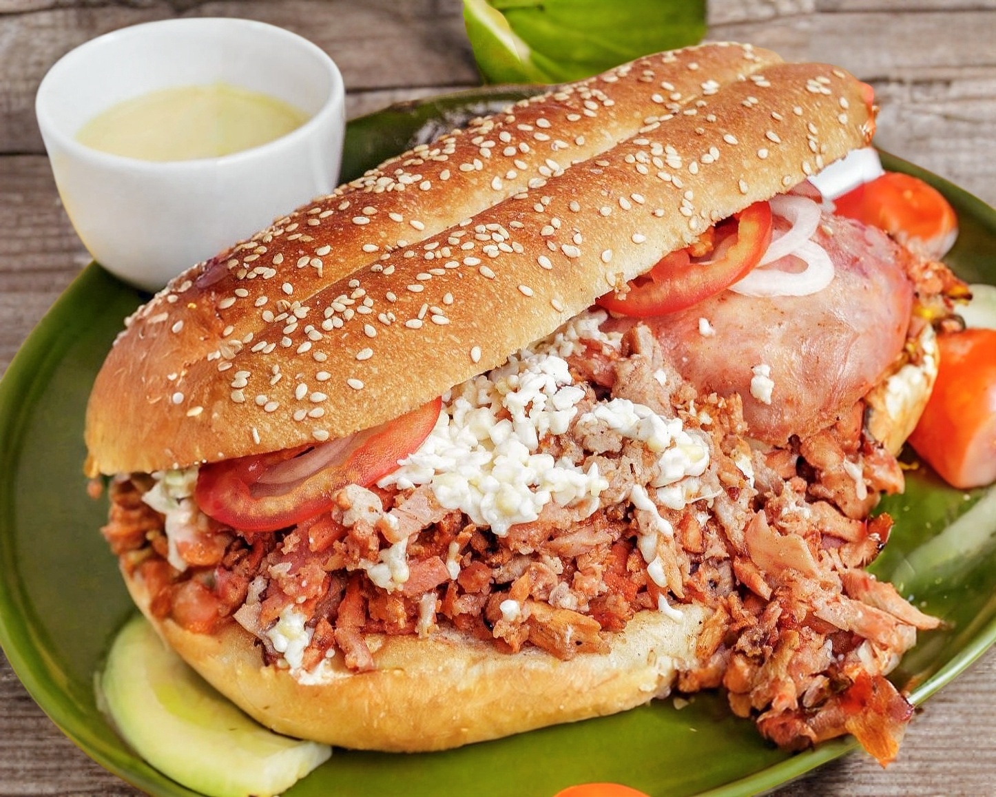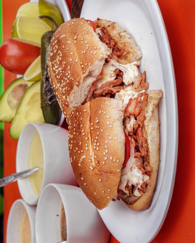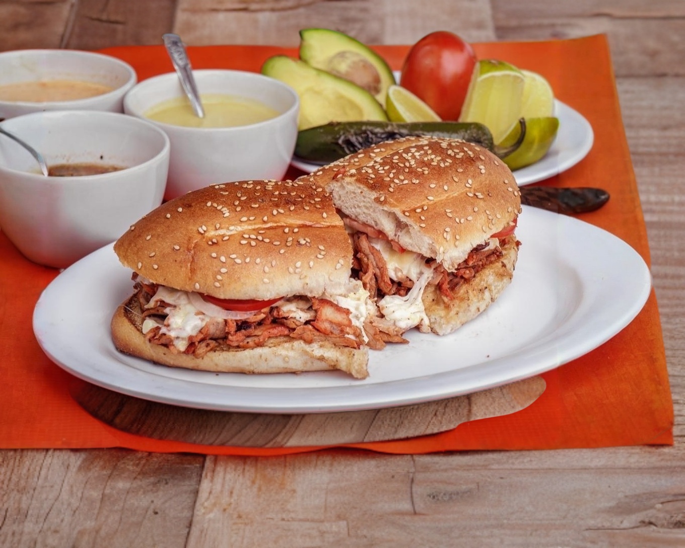 2 RICAS TORTAS DE CARNE AL PASTOR CON QUESO GRATINADO, CEBOLLA, JITOMATE Y AGUACATE, FRIJOLES Y MAYONESA EN TELERA CHICA.