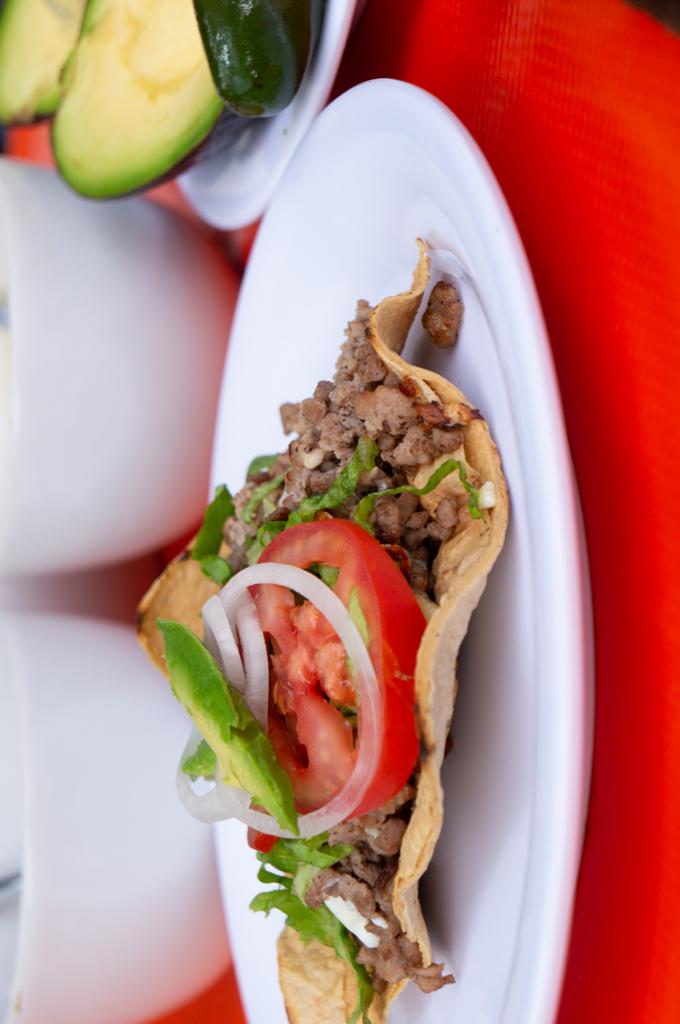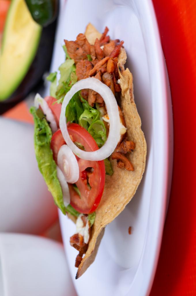 Rica carne de pastor, acompanado de cebolla, jitomate y aguacate con queso gratinado,