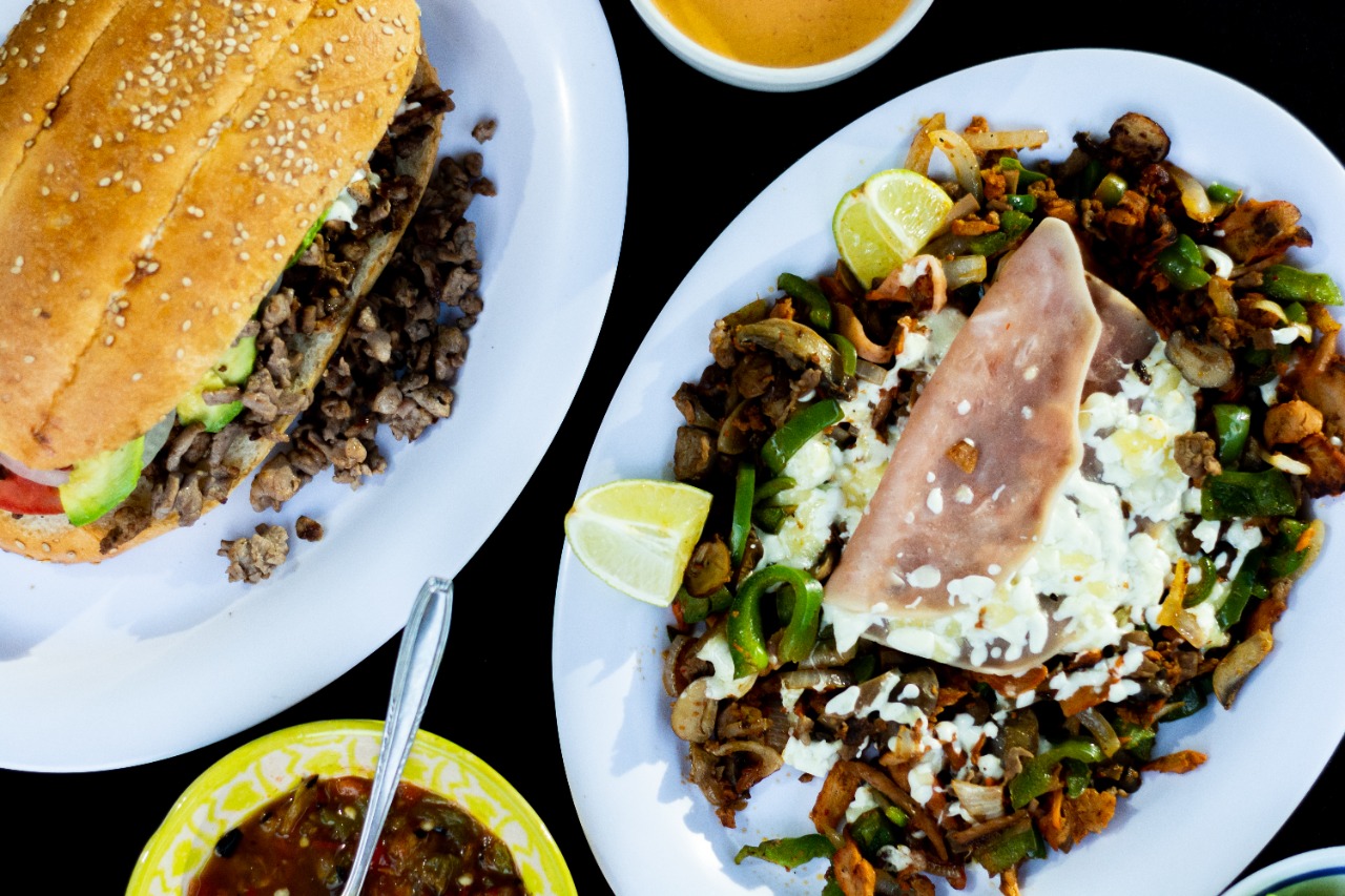 Rica mezcla de bistec, chuleta y pastor, acompañadas con queso, jitomate, cebolla y aguacate.