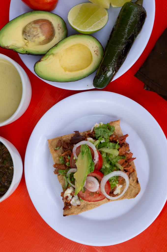 Rica tostada de chuleta de puerto con queso gratinado, cebolla, jitomate y aguacate.