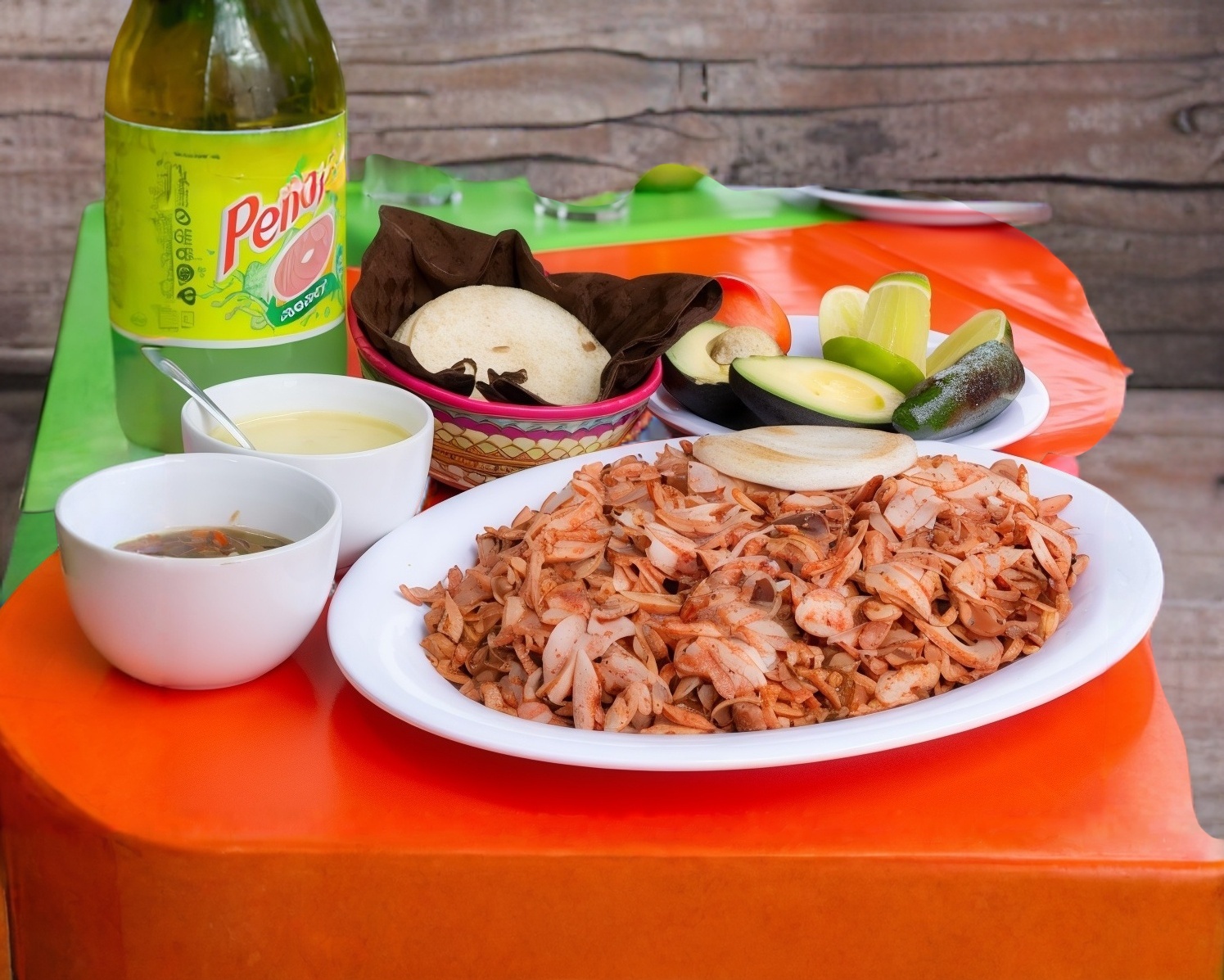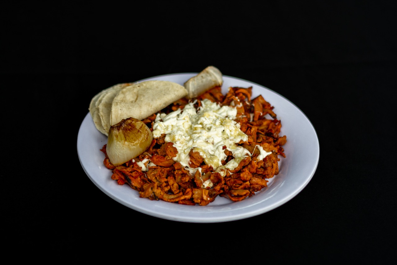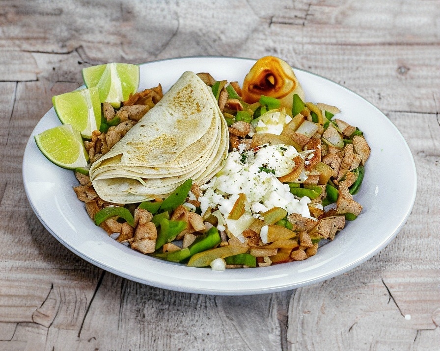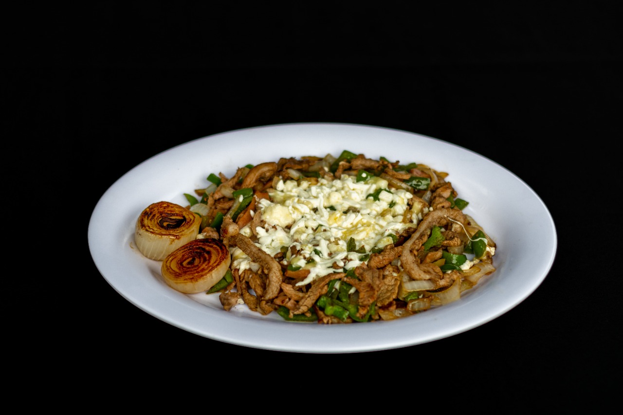 Rica carne de puerco combinada con pimiento morrón, cebolla, tocineta de pavo, queso gratinado, tortillas y salsa.