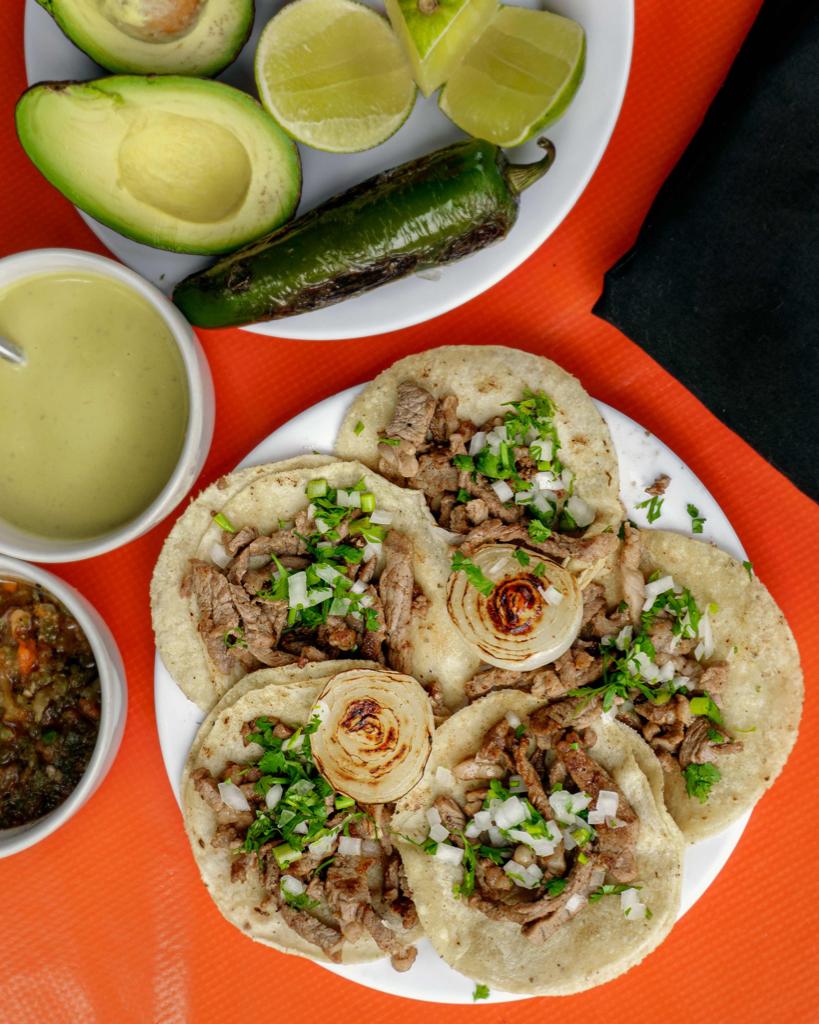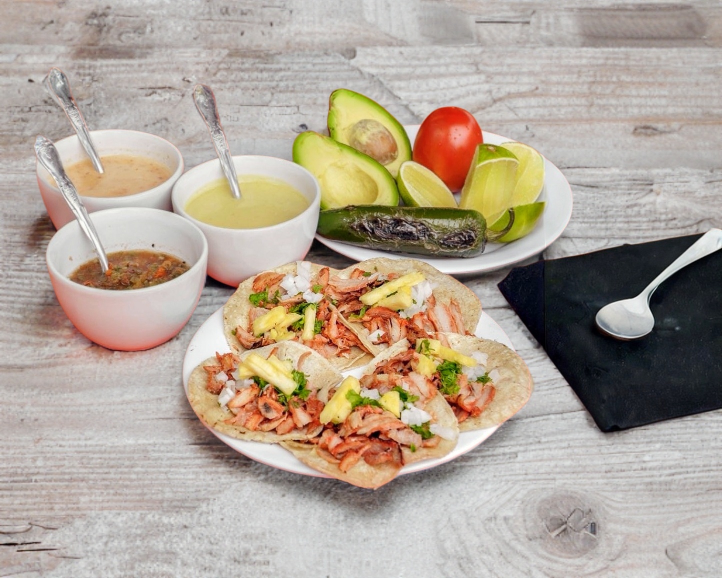 Deliciosa carne al pastor, incluye cebollitas asadas, tortilla, cebolla, cilantro.