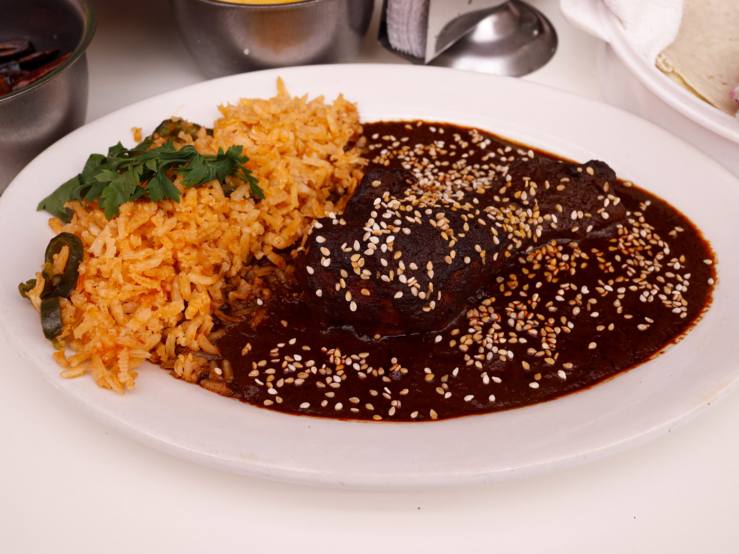 Pollo en Mole, frijoles, arroz con 6 tortillas.