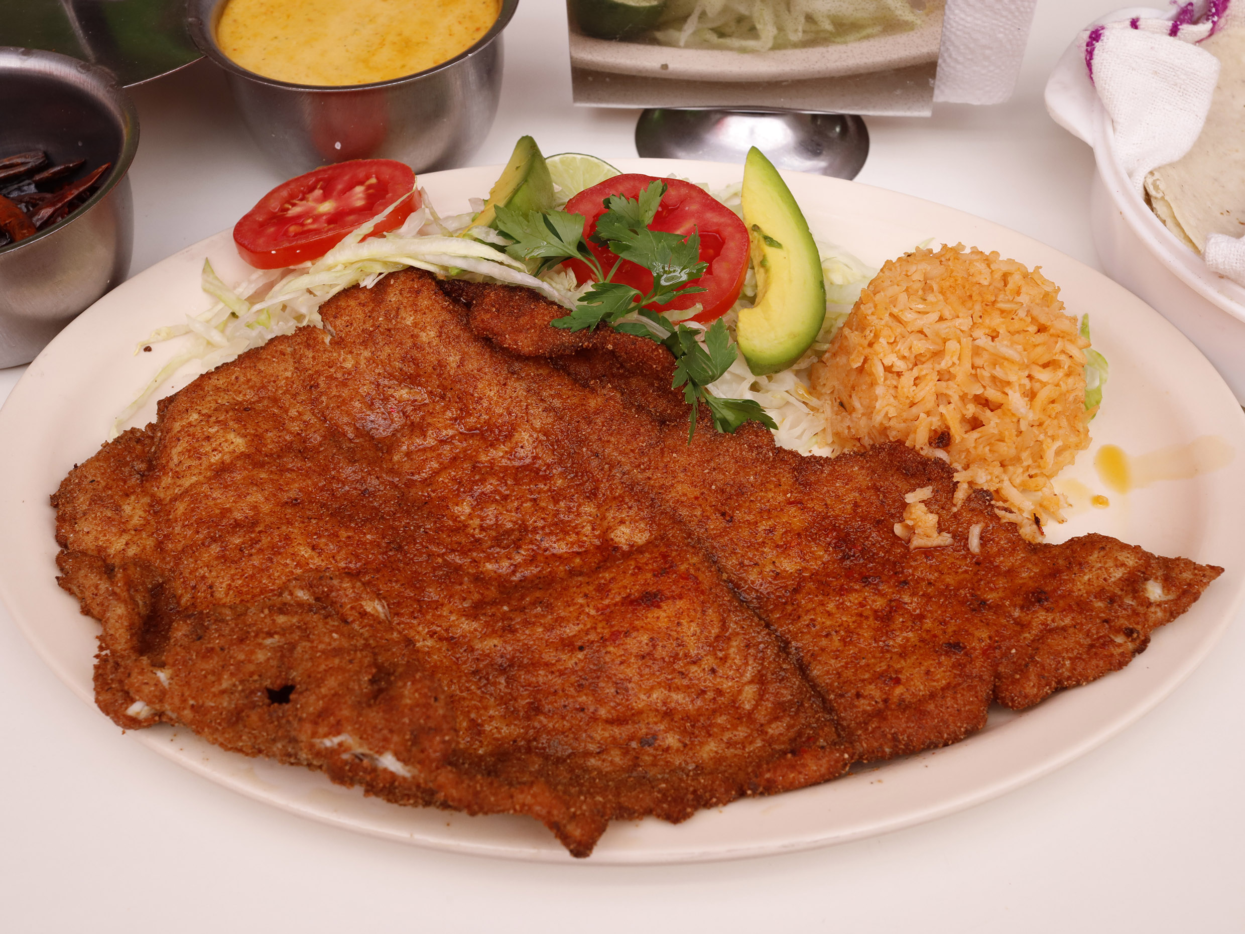 Mojarra al mojo de ajo, acompañada de arroz, ensalda deaguacate, jitomate, pepino y salsa.