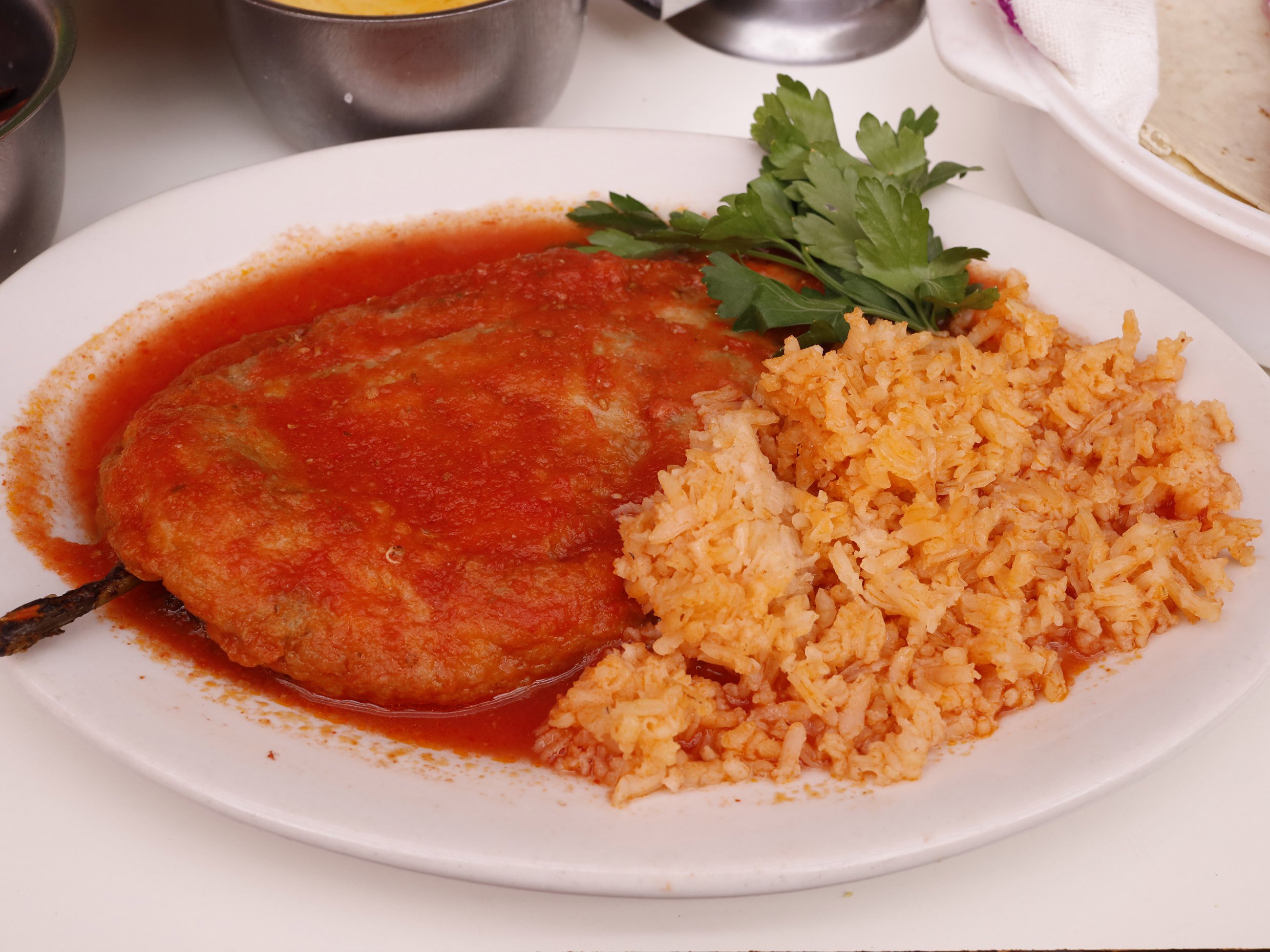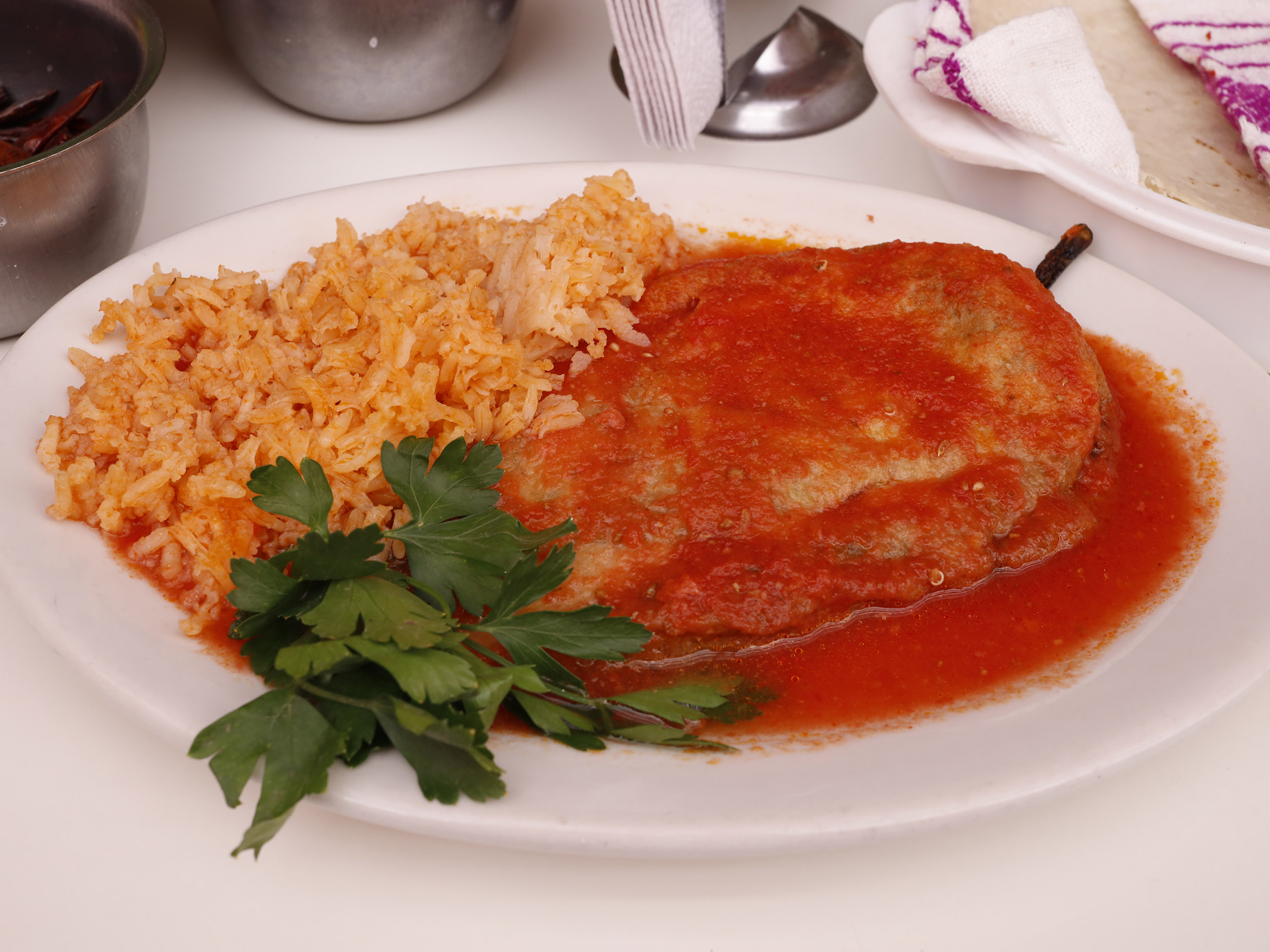 Chiles rellenos de queso en caldillo de jitomate, arroz y frijoles con 6 torillas.