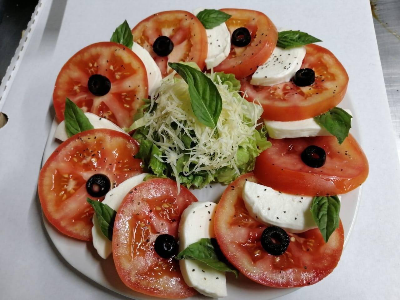 Rodajas de jitomate con queso mozzarella, albahaca, aceite de olivo y vinagre balsámico.