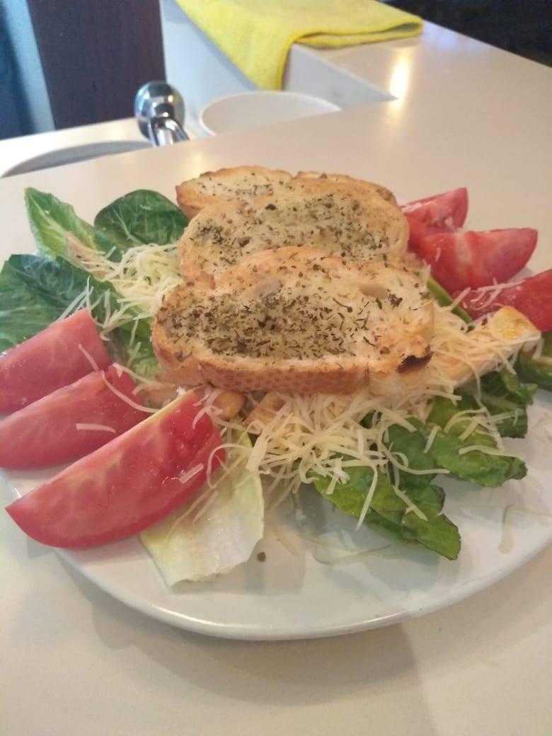 Lechuga orejona, pechuga de pollo a la plancha, queso parmesano y la clásica vinagreta.