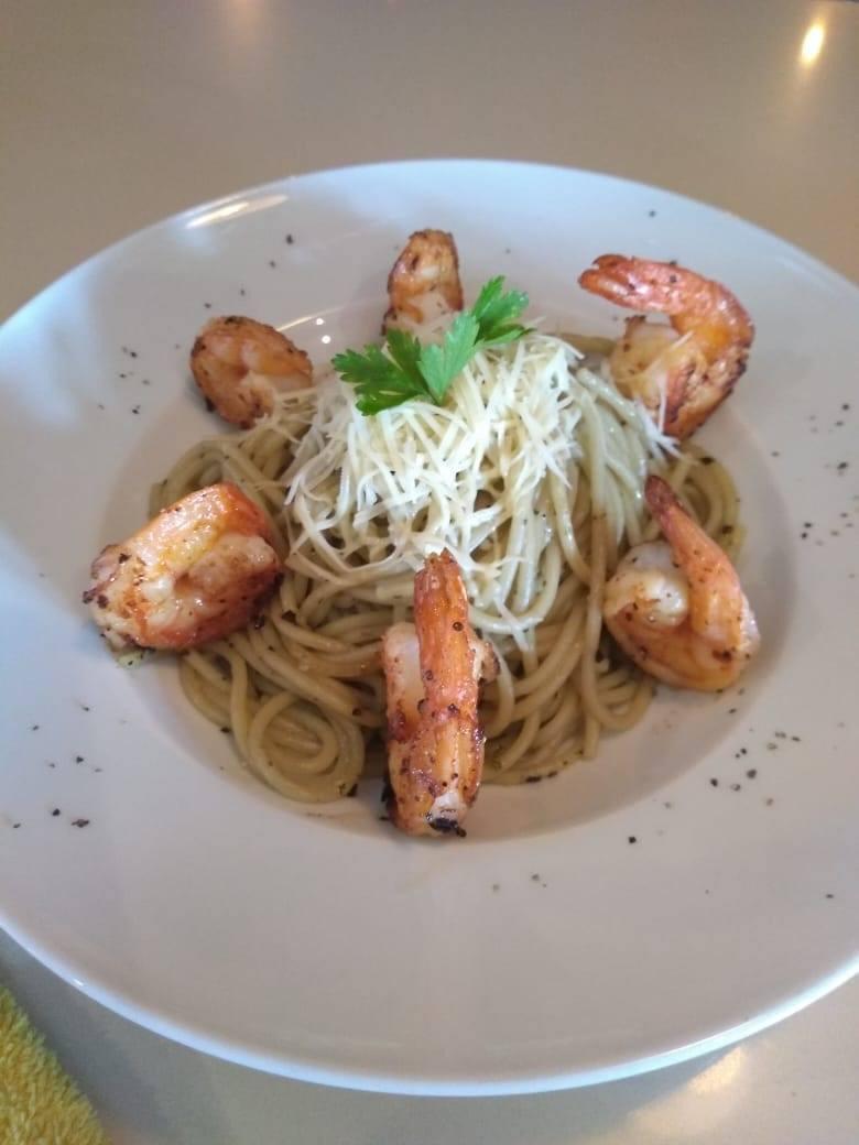 A la mantequilla en una salsa de tomate con camarones, ostión y pulpo.