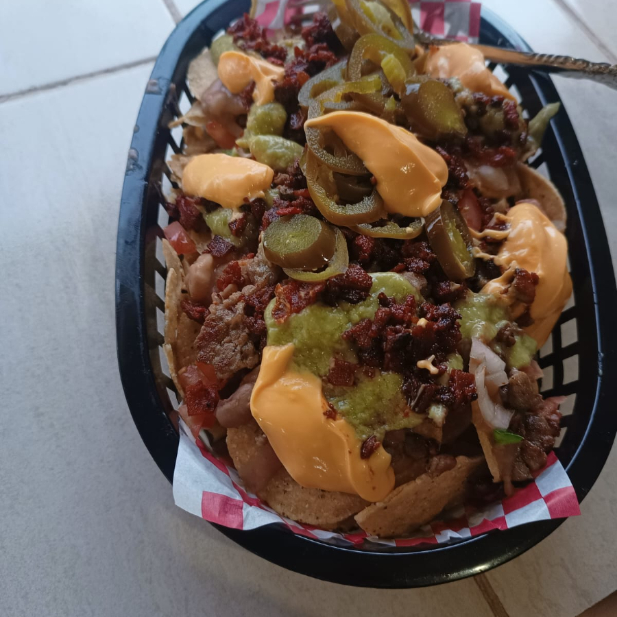 200 gr nachos, frijoles, bisteck, pico de gallo (jitomate, chile, cebolla)
