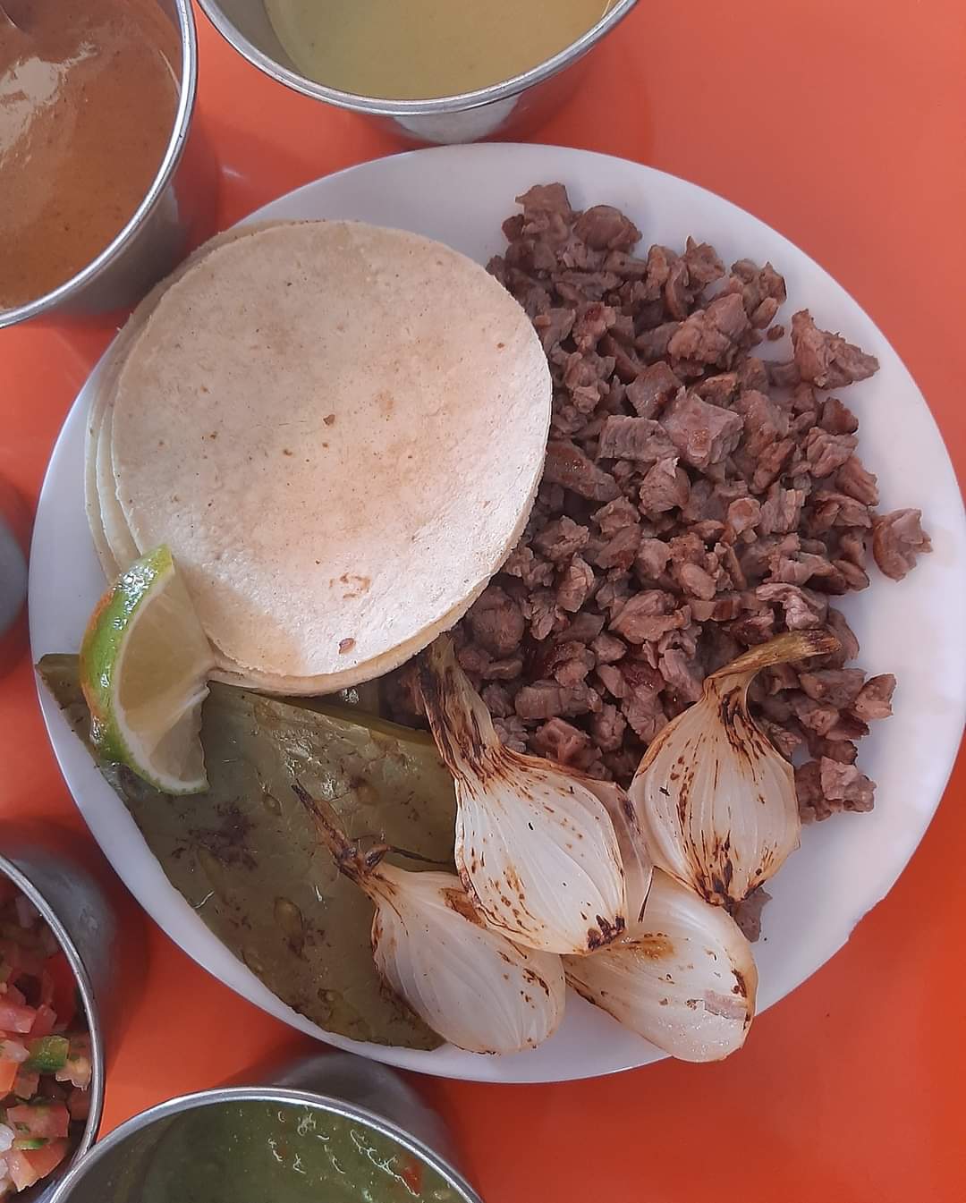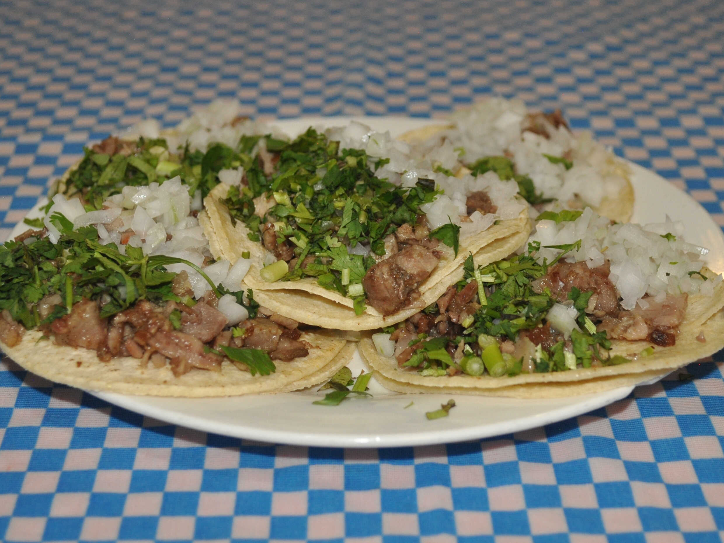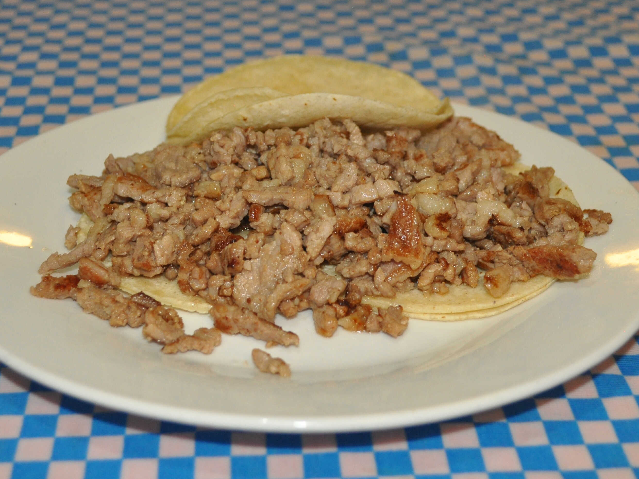 Taco de arrachera con carne picada y cebolla cambray – dos tortillas abajo, una arriba