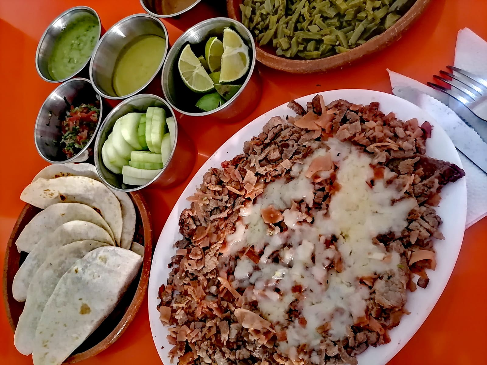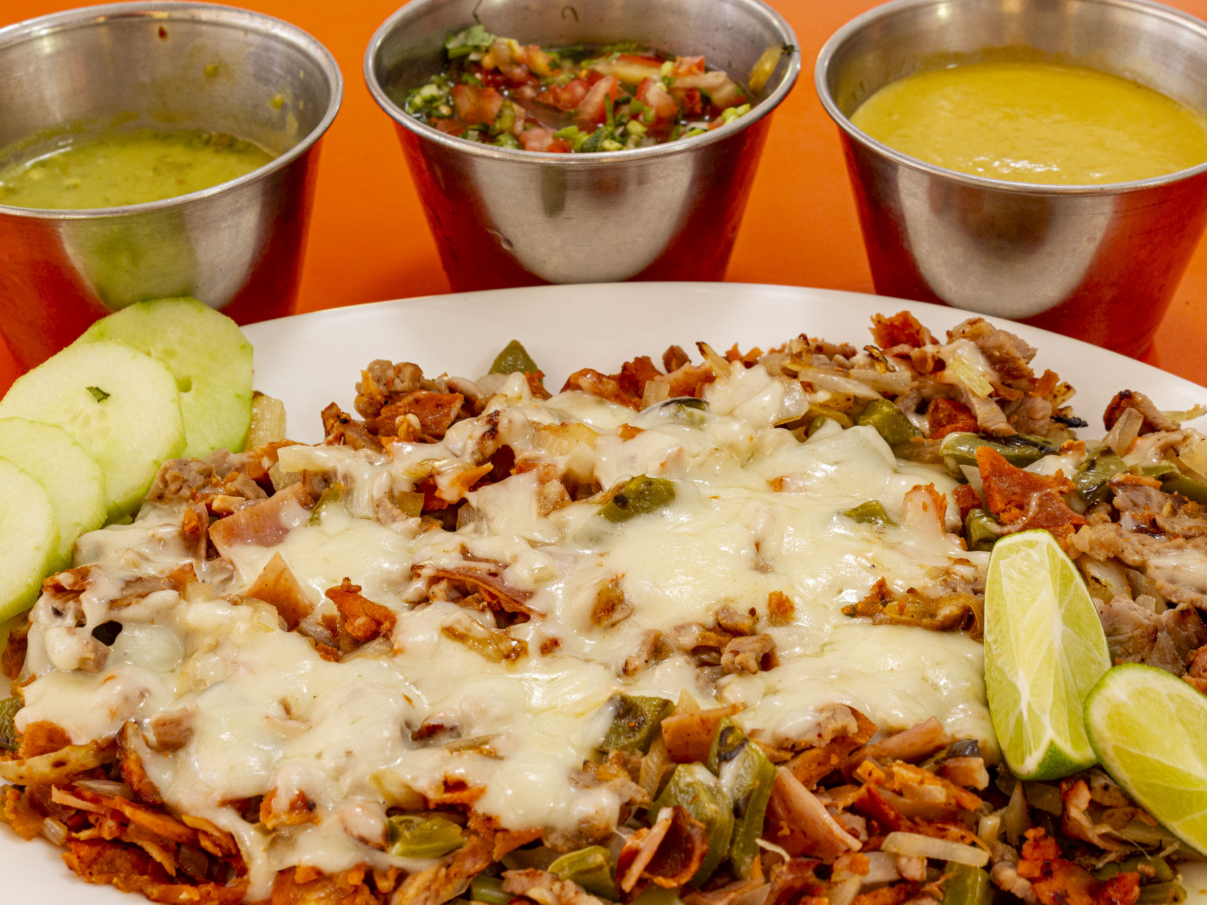 Bistec, pastor, tocino, queso, nopales y cebolla.