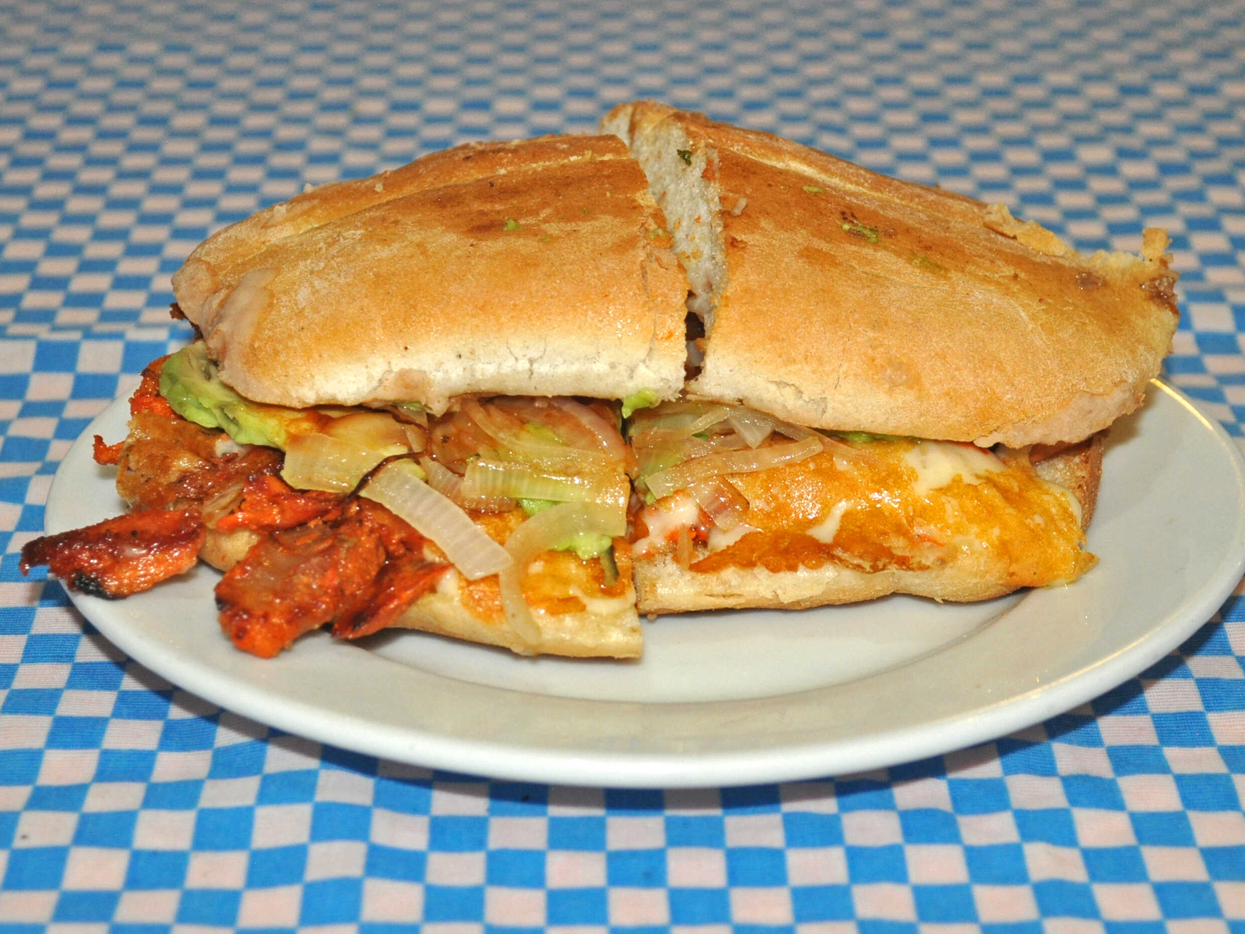 Milanesa, pierna, pastor, jamón, queso, (jitomate, cebolla, aderezo de chipotle y aguacate)