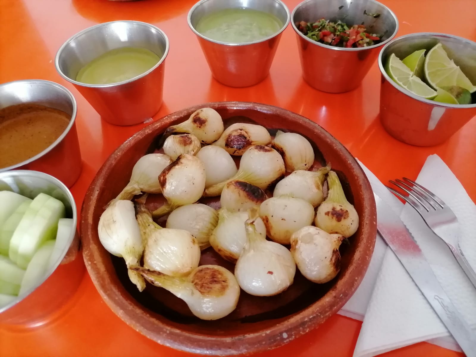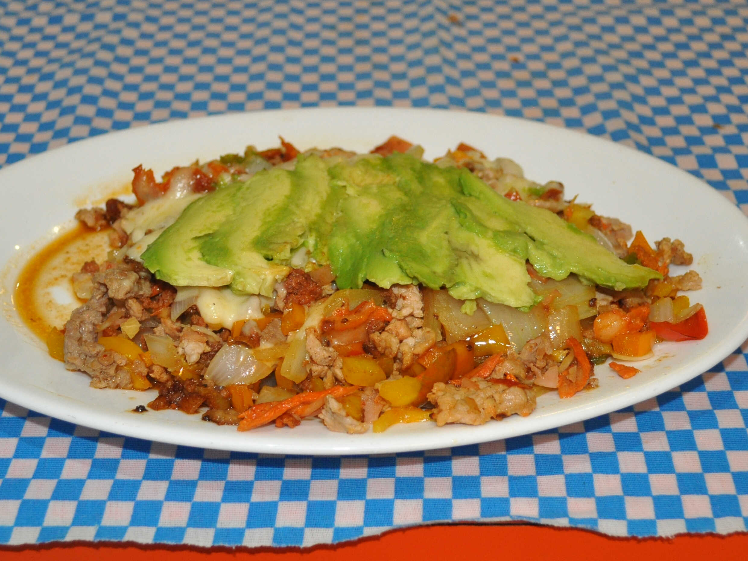 Cebolla, morrón, champiñones, piña, nopales, jitomate, aguacate y queso.