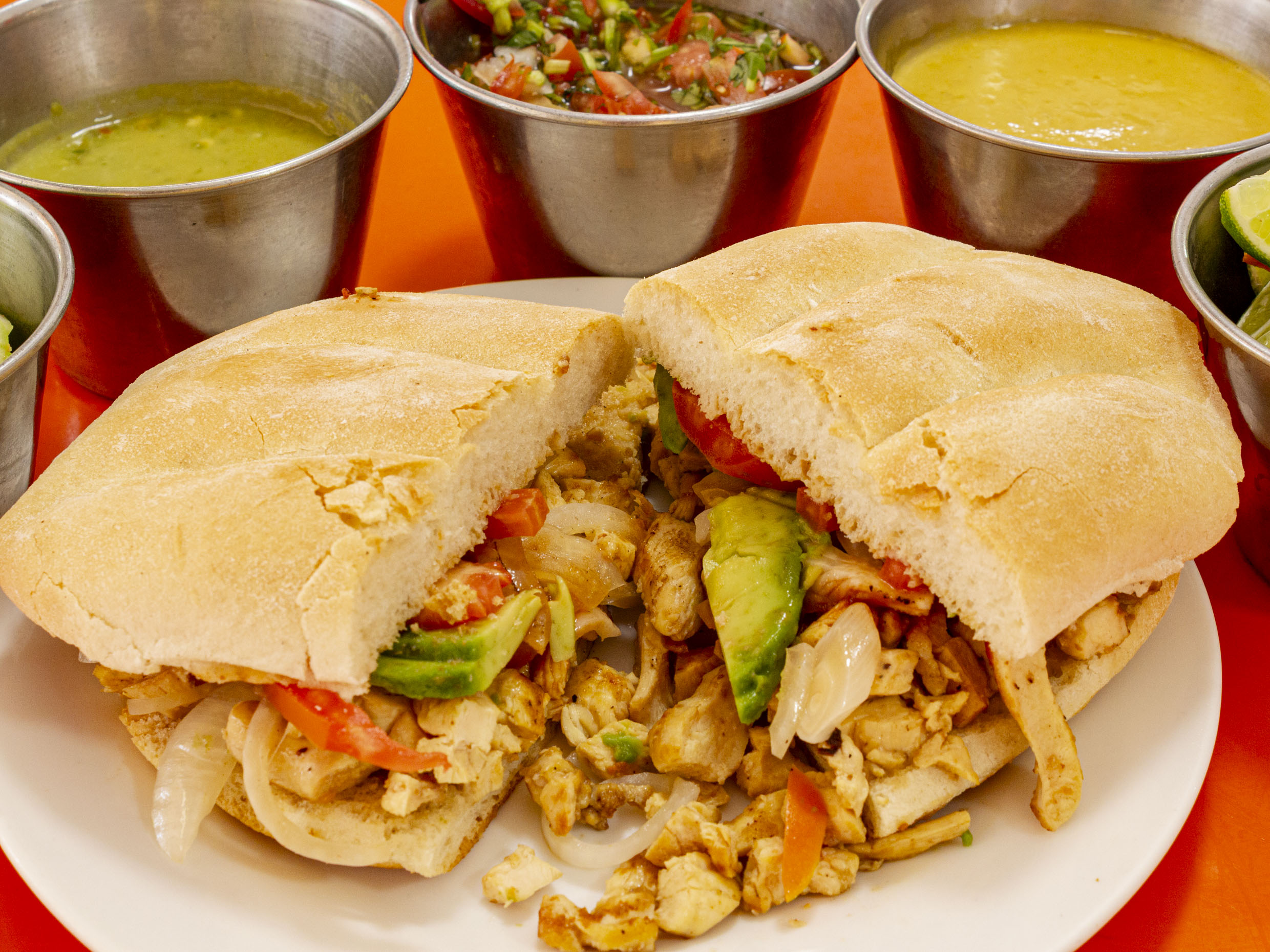 1 unidad de pan de telera, acompañada con frijoles, jitomate, cebolla, aguacate y aderezo de chipotle