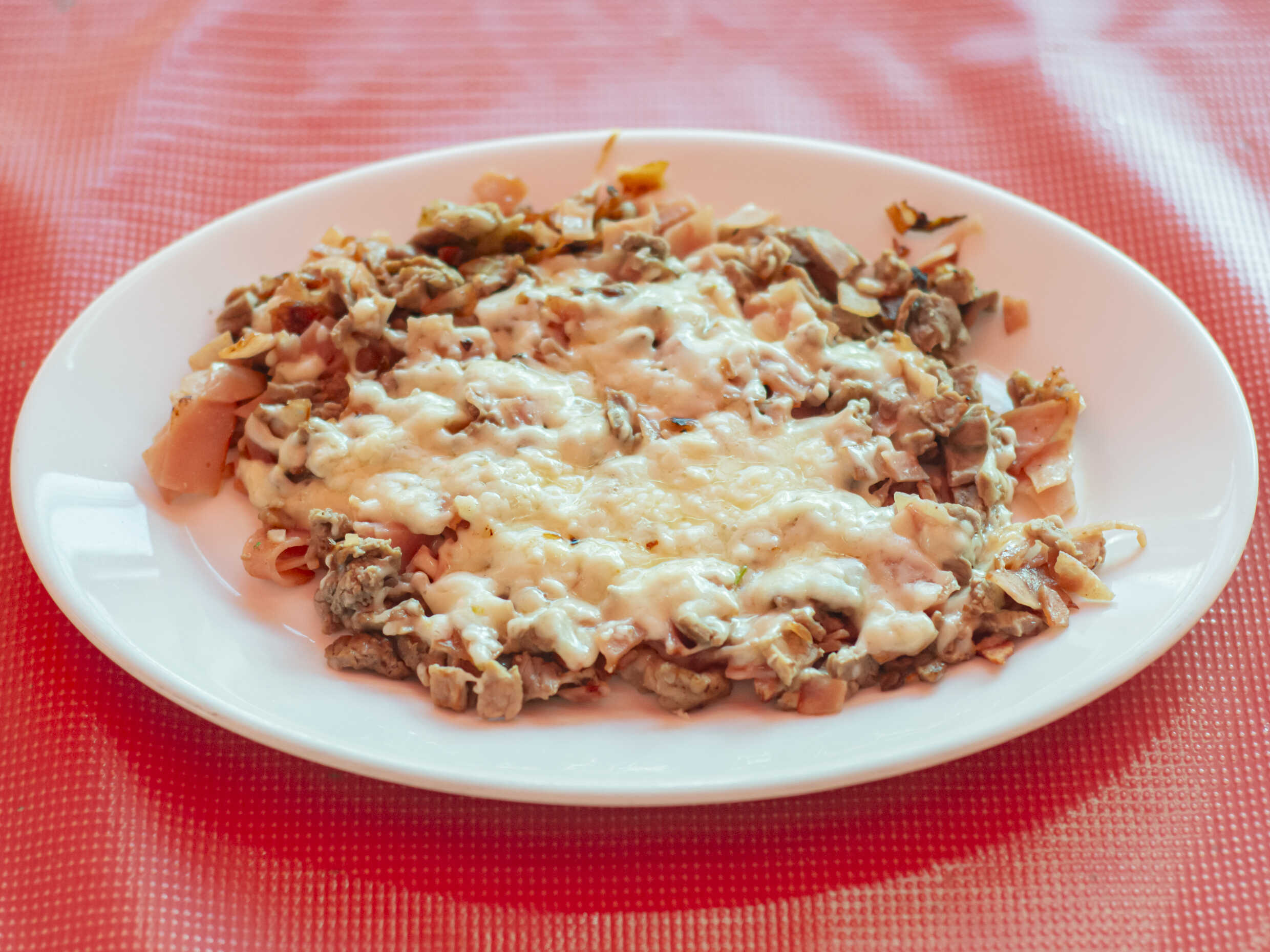 Bistec, chorizo, tocino, y queso gratinado.