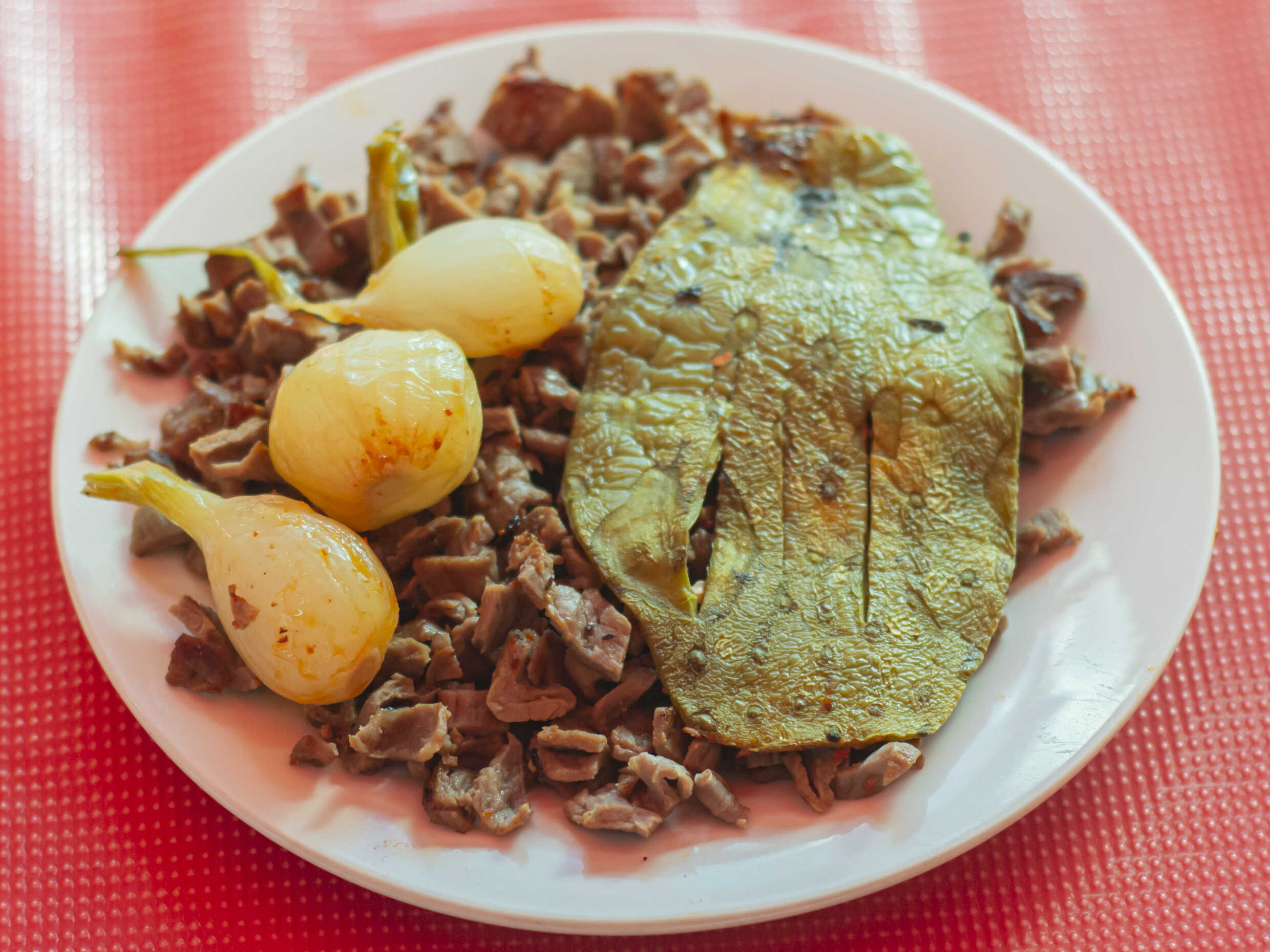 Bistec, tocino, morrón, jitomate y queso gratinado.