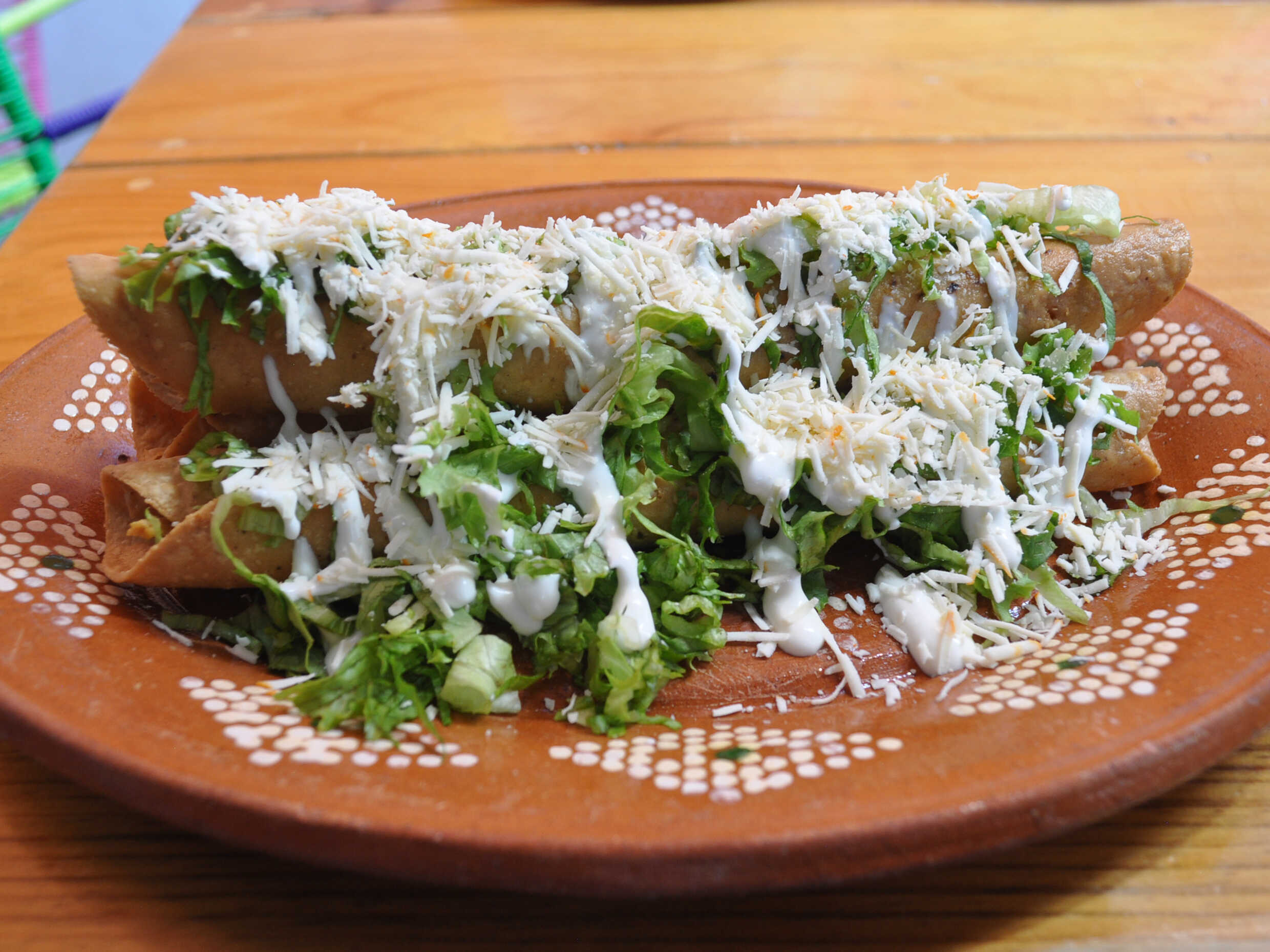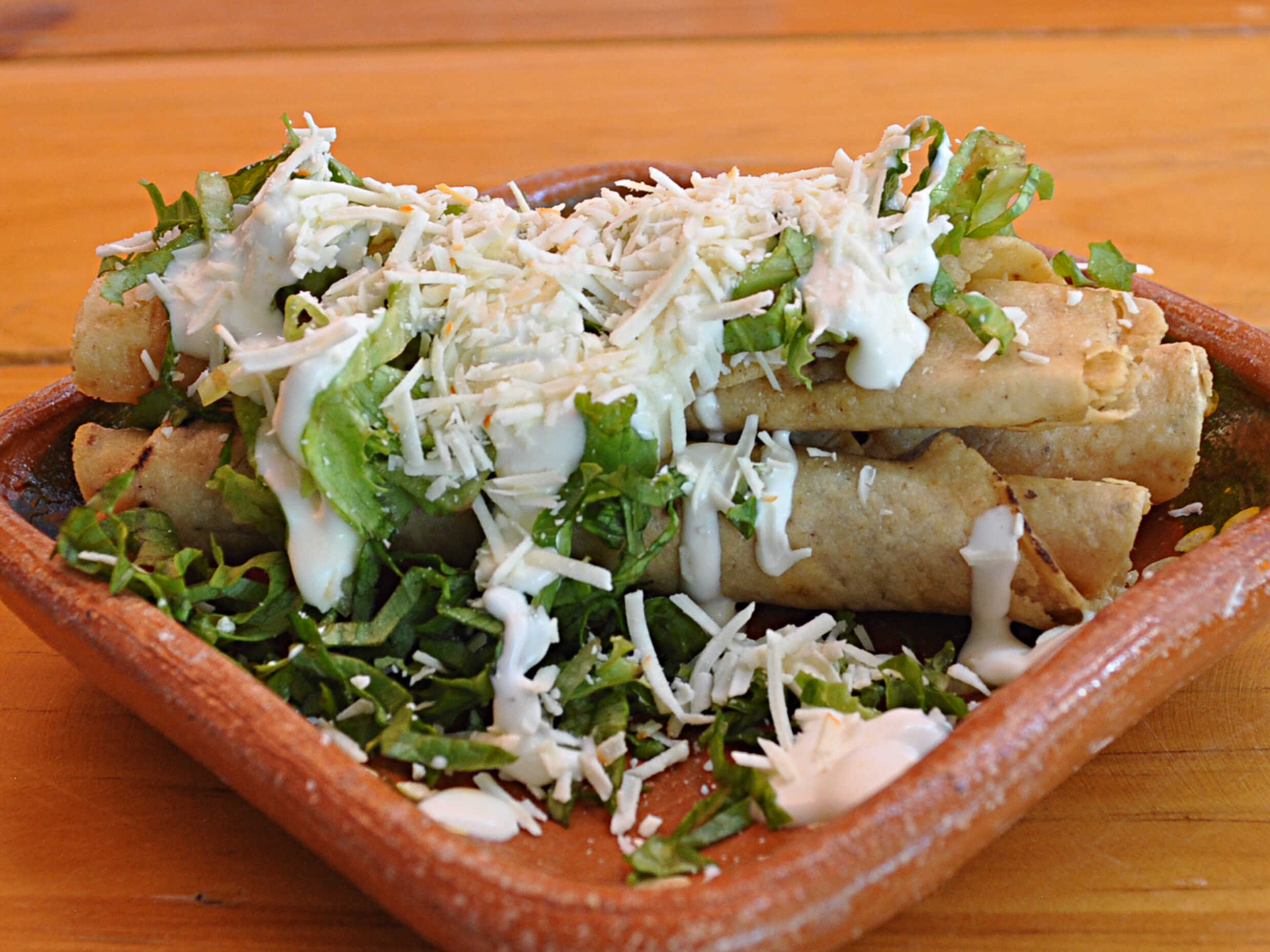 Tres taquitos de tortilla de maiz, rellenos, dorados en aceite vegetal, preparados con lechuga, crema y queso.