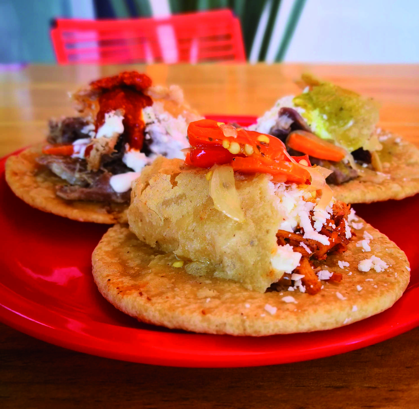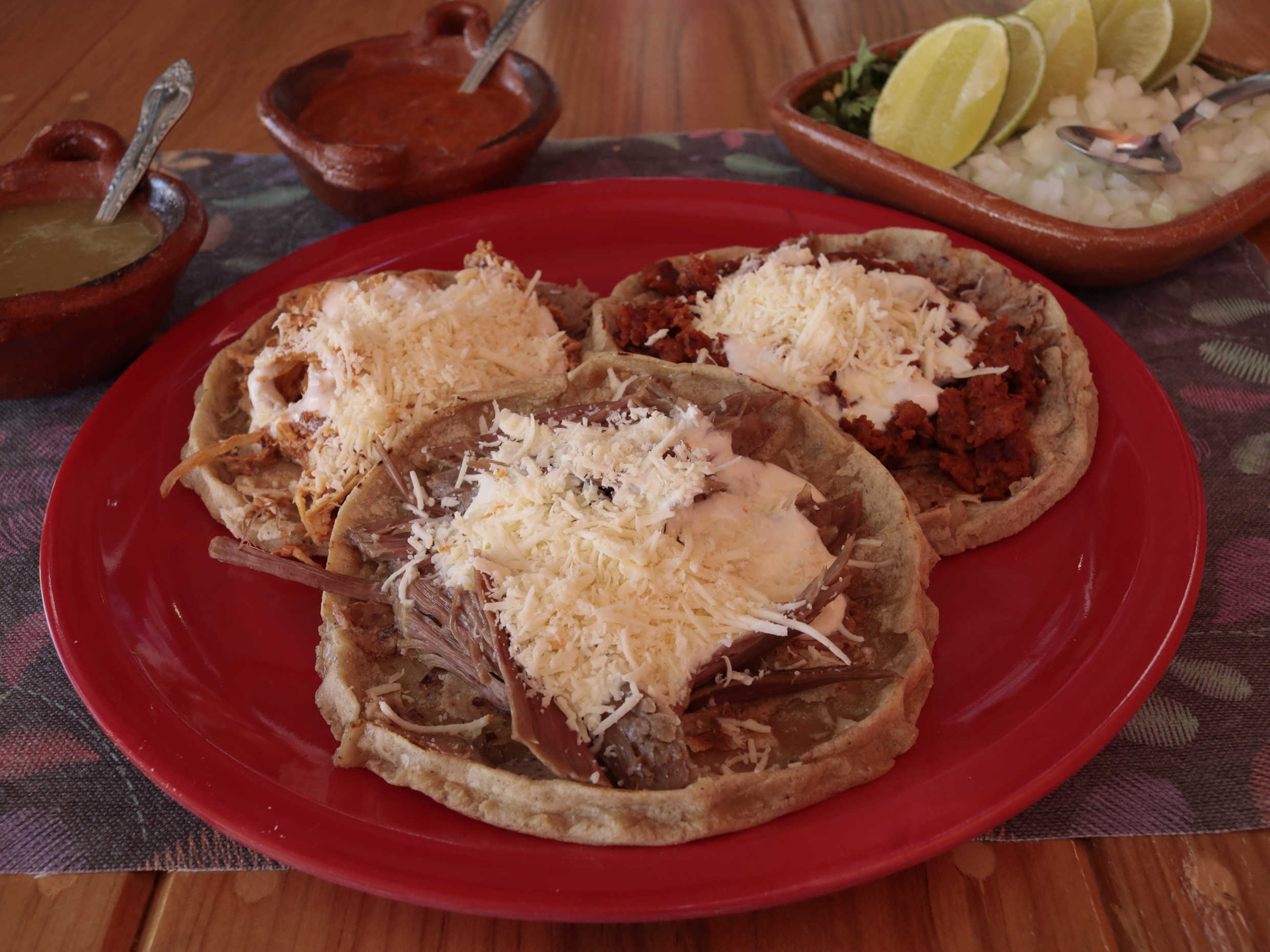 Gorditas fritas rellenas de frijoles, con guisado, crema y queso rayado.