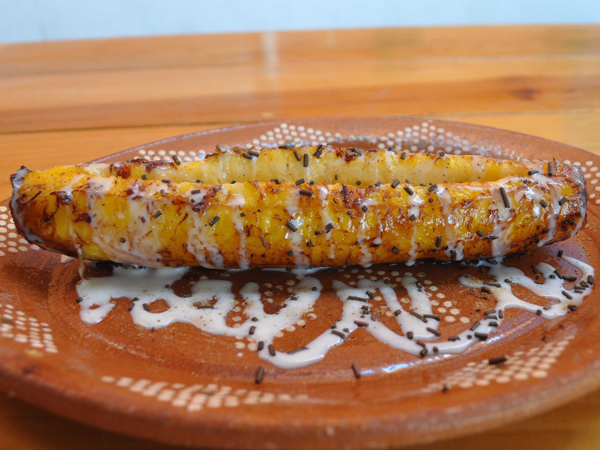 Plátano macho frito, con crema dulce, granillo de chocolate y canela.